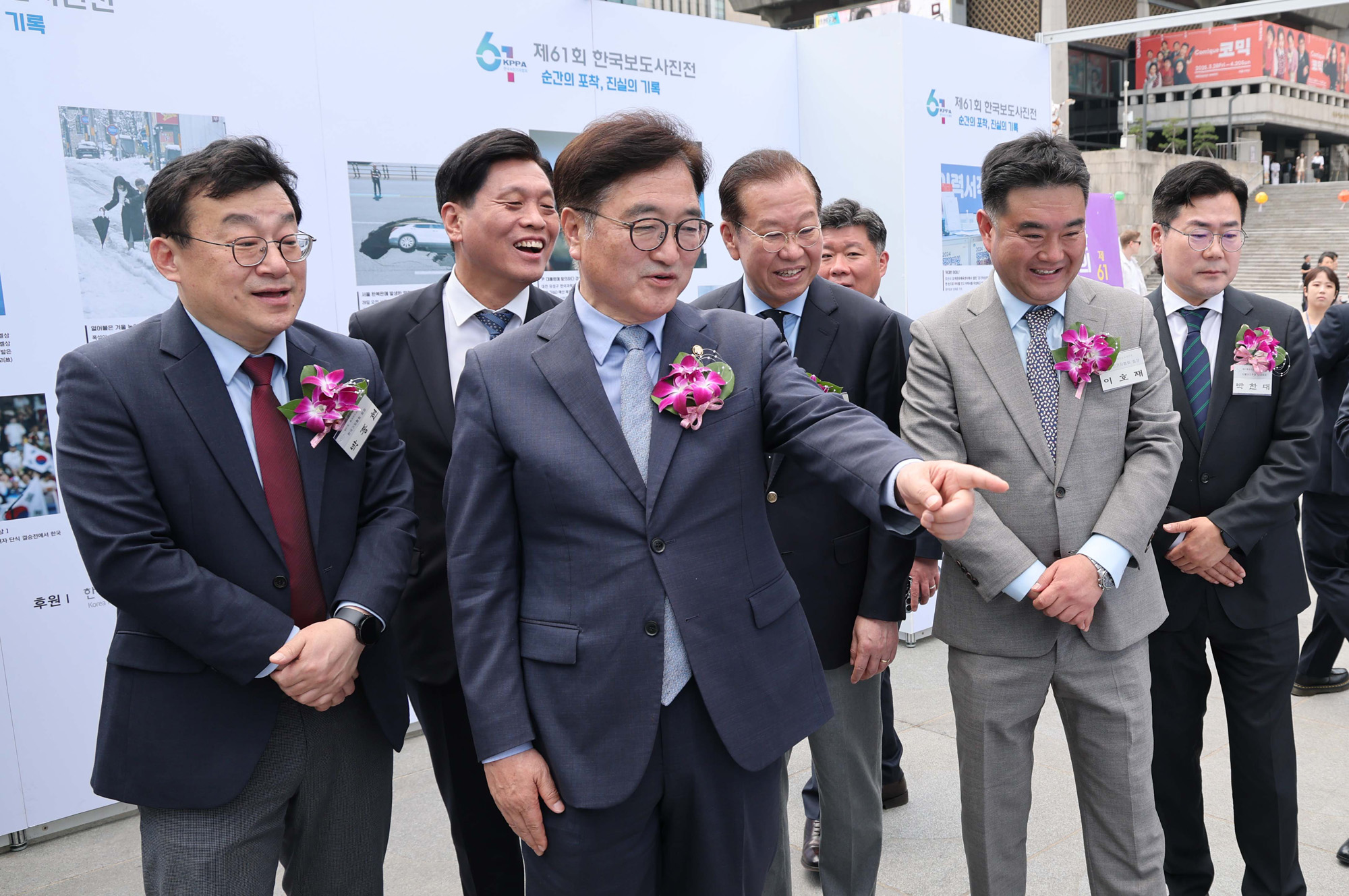 | 사진설명 | 이호재 한국사진기자협회장, 우원식 국회의장, 박찬대 더불어민주당 당대표 직무대행 겸 원내대표, 권영세 국민의힘 비상대책위원장, 오세훈 서울시장 등 내빈들이 21일 서울 종로구 광화문 광장에서 열린 제61회 한국보도사진전 '순간의 포착, 진실의 기록' 개막식에서 작품을 관람하고 있다. 2025.4.21 사진공동취재단 |