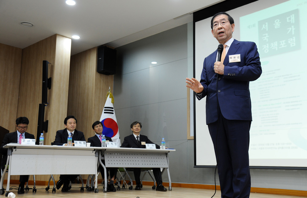 27일 오후 서울 관악구 서울대학교 아시아연구소에서 열린 제1회 '서울대 국가정책포럼'에서 박원순 서울시장이 강연을 하고 있다. 서울시 제공