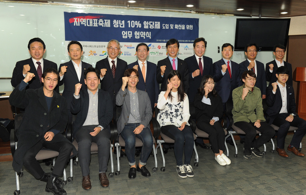 27일 서울 세종로 한국프레스센터에서 열린 ’지역 대표축제 청년 10% 할당제 업무협약식’에서 김영만(왼쪽 세번째) 서울신문 사장과 박원순(왼쪽 네번째) 서울시장을 비롯한 전국 13개 광역자치단체장이 협약을 체결한 뒤 청년들과 함께 기념촬영을 하고 있다. 서울시 제공