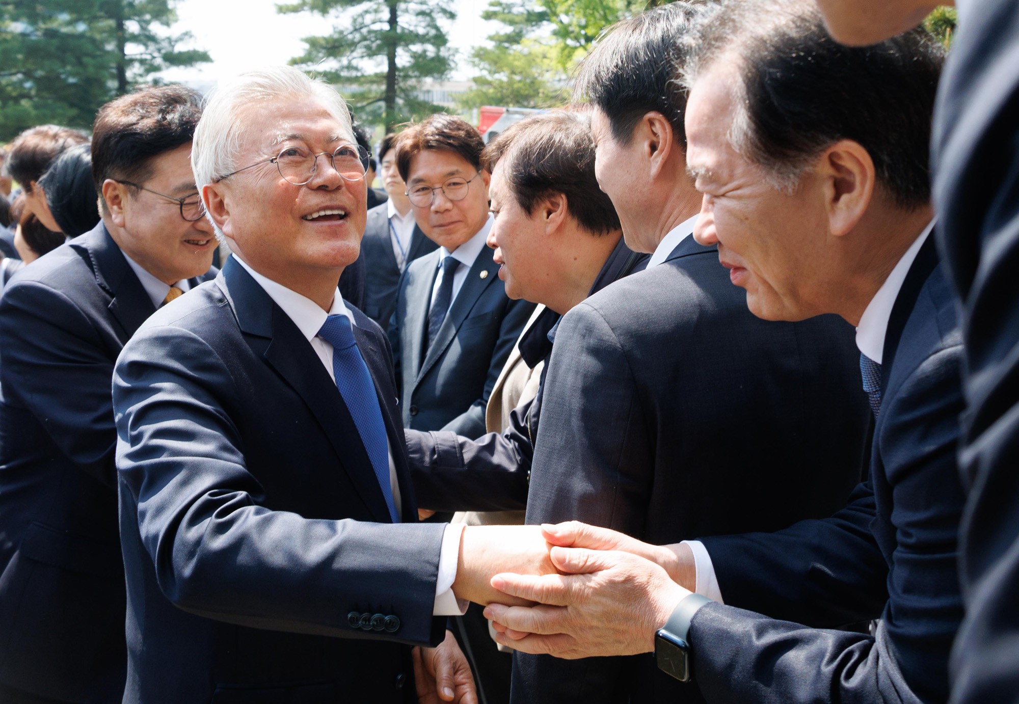 문재인 전 대통령이 25일 오후 서울 여의도 국회 도서관에서 열린 4.27 판문점선언 7주년 기념식에 참석하며 더불어민주당 의원들과 인사를 나누고 있다. 2025.04.25. 국회사진취재단