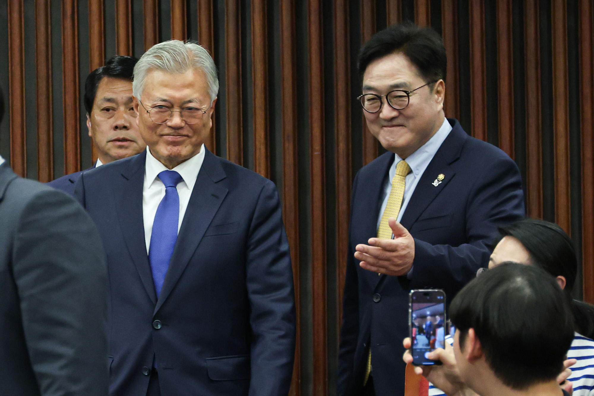 문재인 전 대통령과 우원식 국회의장이 25일 서울 여의도 국회도서관에서 열린 4.27 판문점선언 7주년 기념식에 참석하고 있다. 2025.04.25. 국회사진취재단