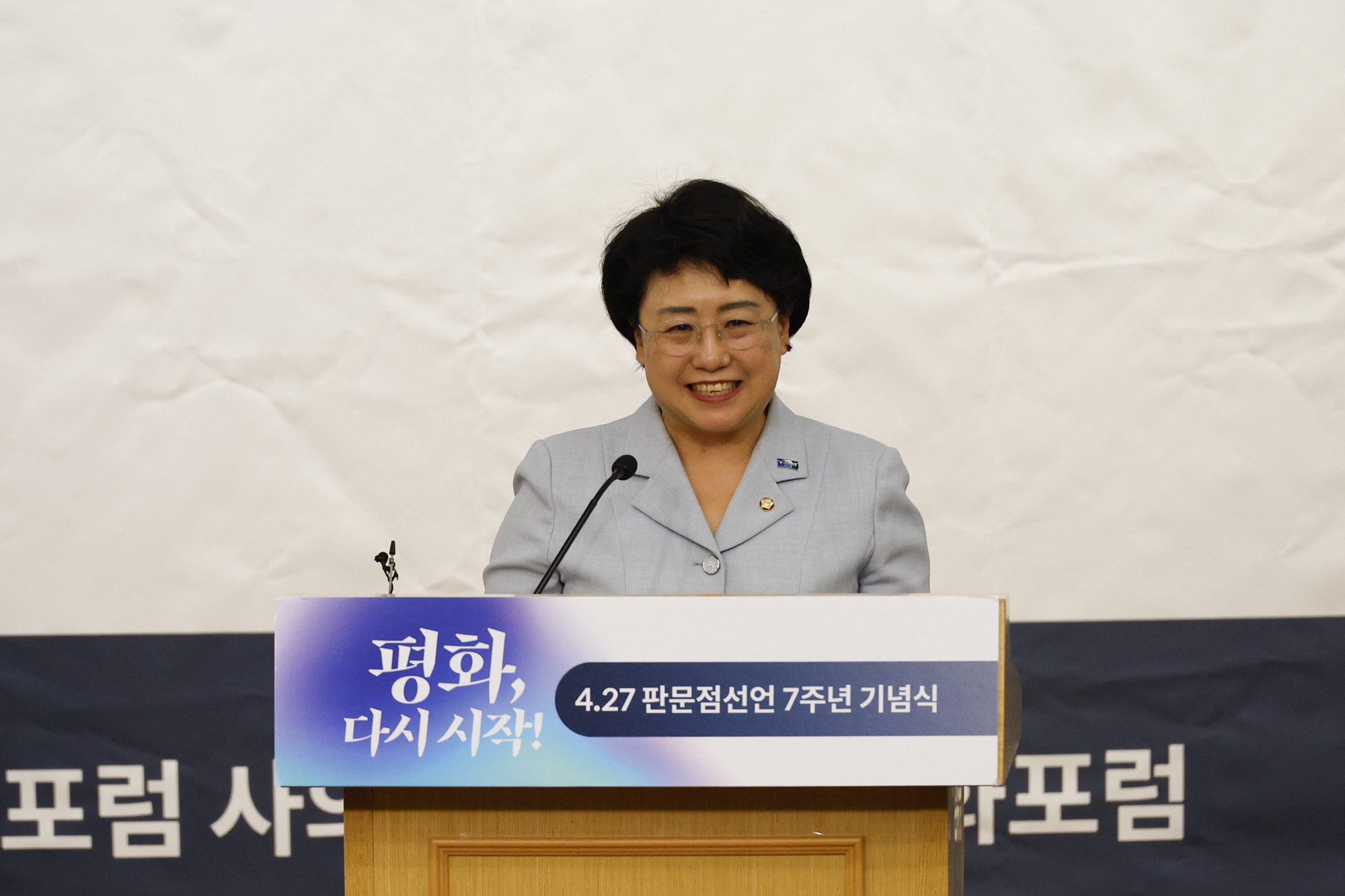김선민 조국혁신당 대표 권한대행이 25일 국회도서관에서 열린 4.27판문점선언 7주년 기념식에서 축사를 하고 있다. 2025.04.25. 국회사진취재단