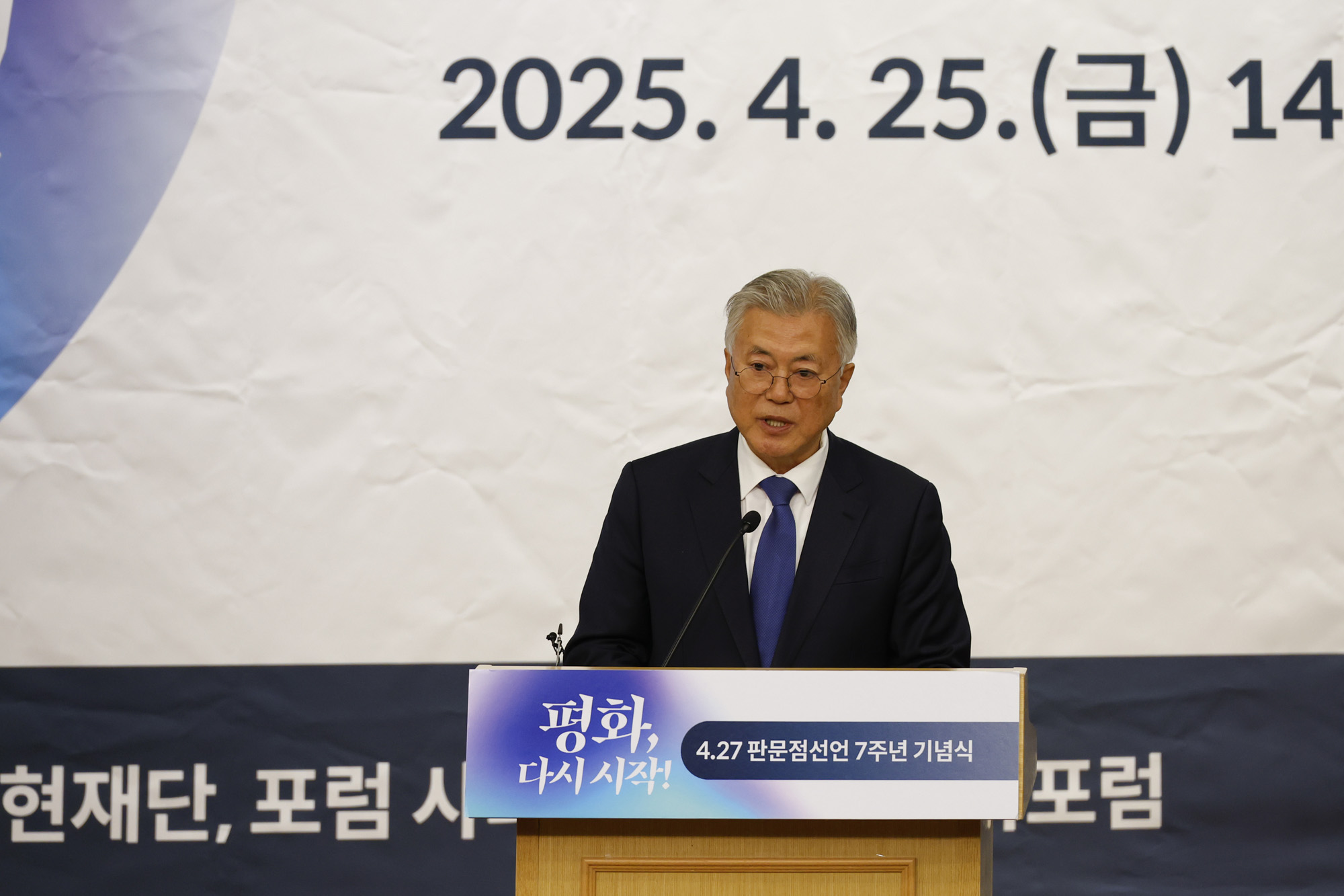 문재인 전 대통령이 25일 국회도서관에서 열린 4.27판문점선언 7주년 기념식에서 기념사를 하고 있다. 2025.04.25. 국회사진취재단