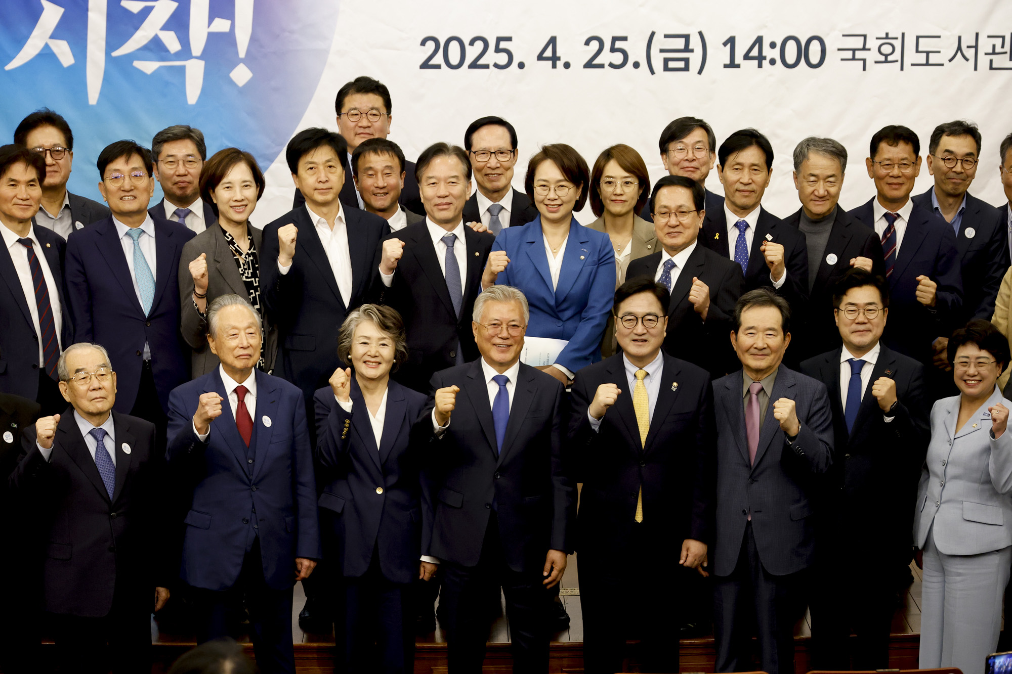 문재인 전 대통령 내외와 우원식 국회의장 등 참석자들이 25일 국회도서관에서 열린 4.27판문점선언 7주년 기념식에서 기념촬영을 하고 있다. 2025.04.25. 국회사진취재단