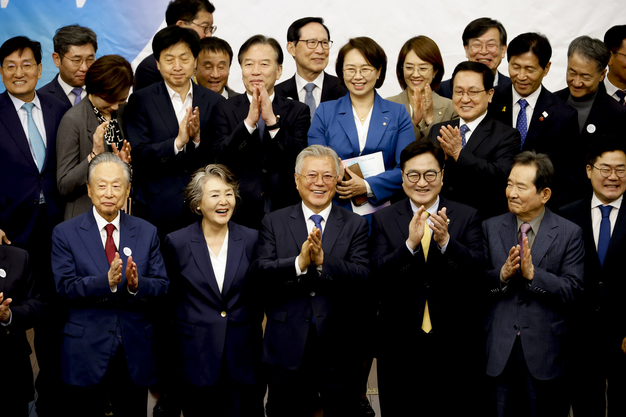 문재인 전 대통령 내외와 우원식 국회의장 등 참석자들이 25일 국회도서관에서 열린 4.27판문점선언 7주년 기념식에서 기념촬영을 하고 있다. 2025.04.25. 국회사진취재단