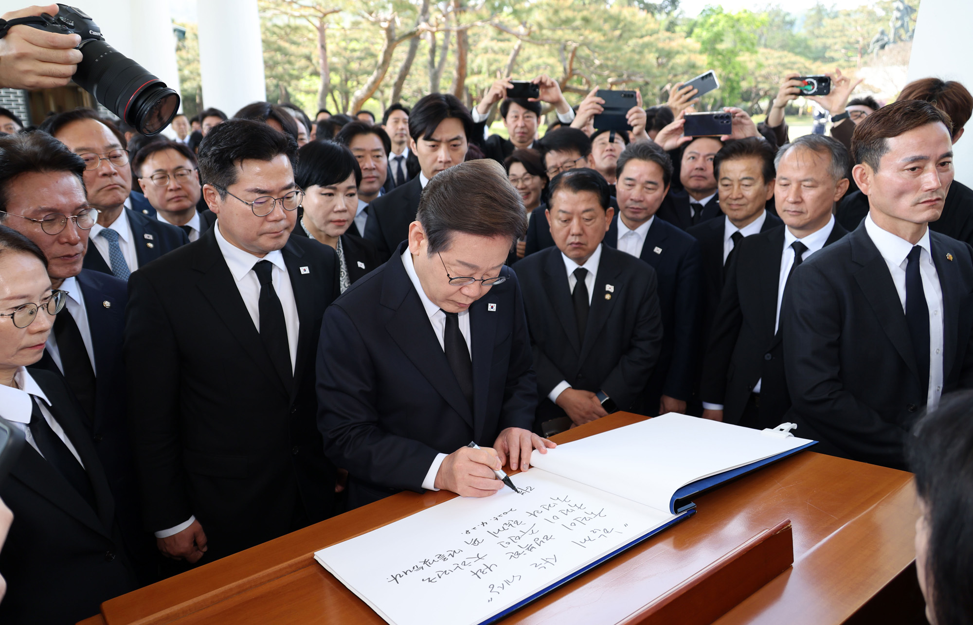 이재명 더불어민주당 제21대 대통령 선거 후보가 28일 오전 서울 동작구 국립서울현충원 현충탑에 참배를 마친 뒤 방명록을 적고 있다.