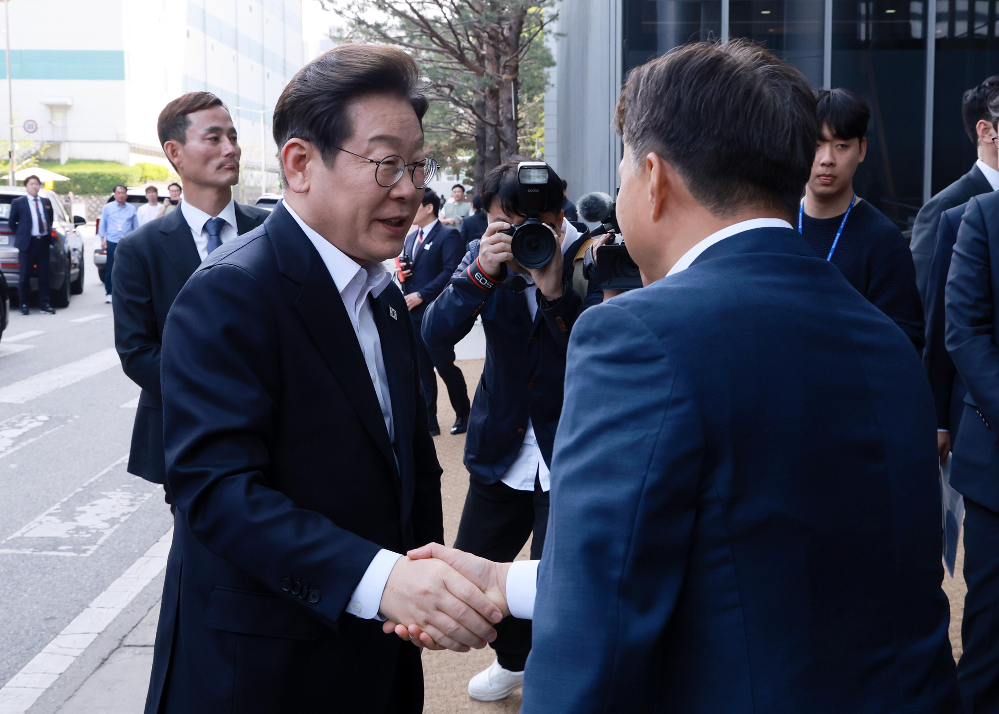 이재명 더불어민주당 대선 후보가 28일 경기 이천시 SK하이닉스에서 열린 ‘K-반도체’ AI메모리반도체 기업 간담회에 참석하며 곽노정 CEO와 인사하고 있다. 2025.4.28 국회사진기자단