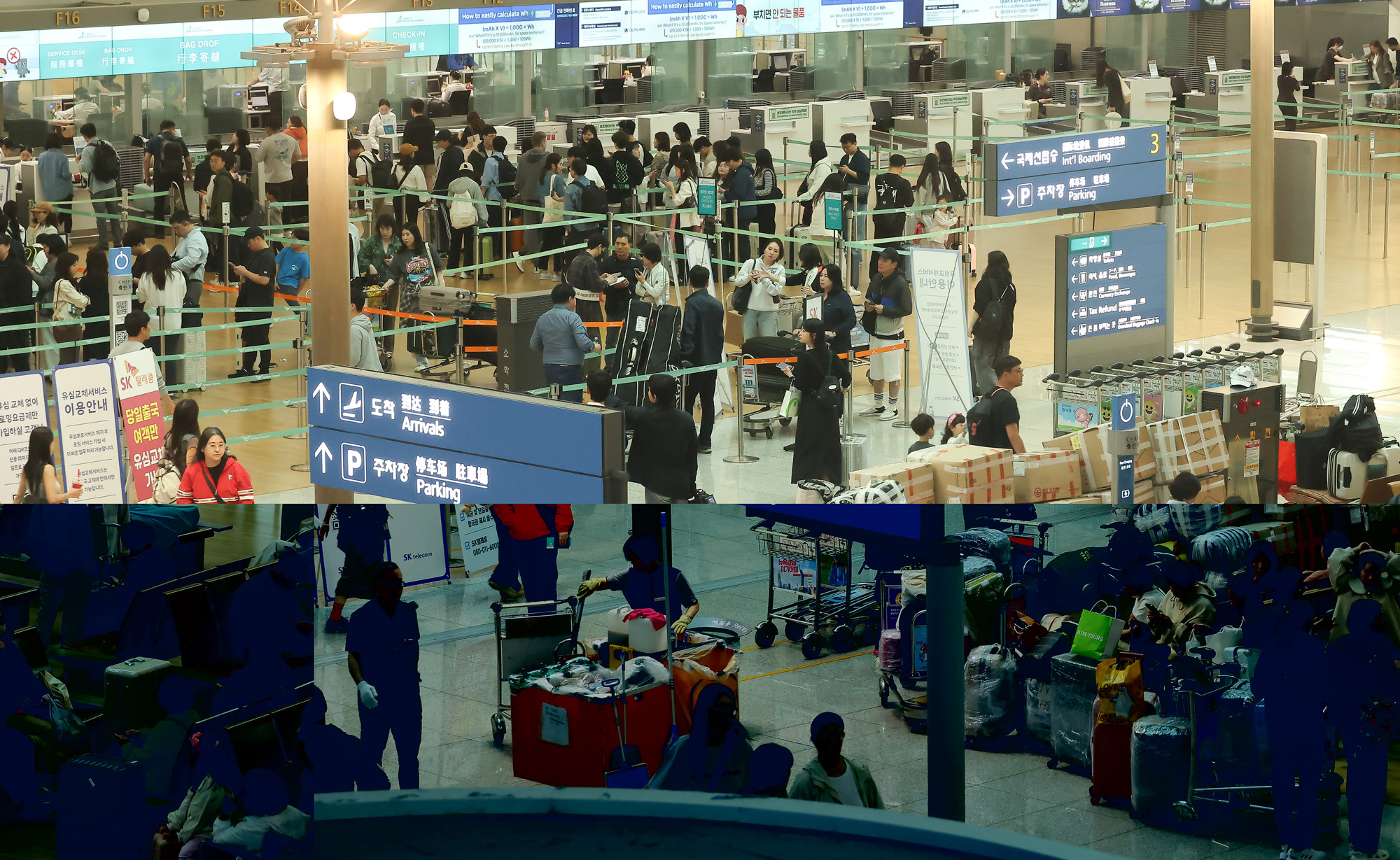 [인천=eoimage] 임준선 기자 = 1일 인천국제공항 제1여객터미널 출국장 내 SK텔레콤 로밍센터에서 출국자들이 유심 교체를 위해 줄을 서고 있다. 2025.05.01