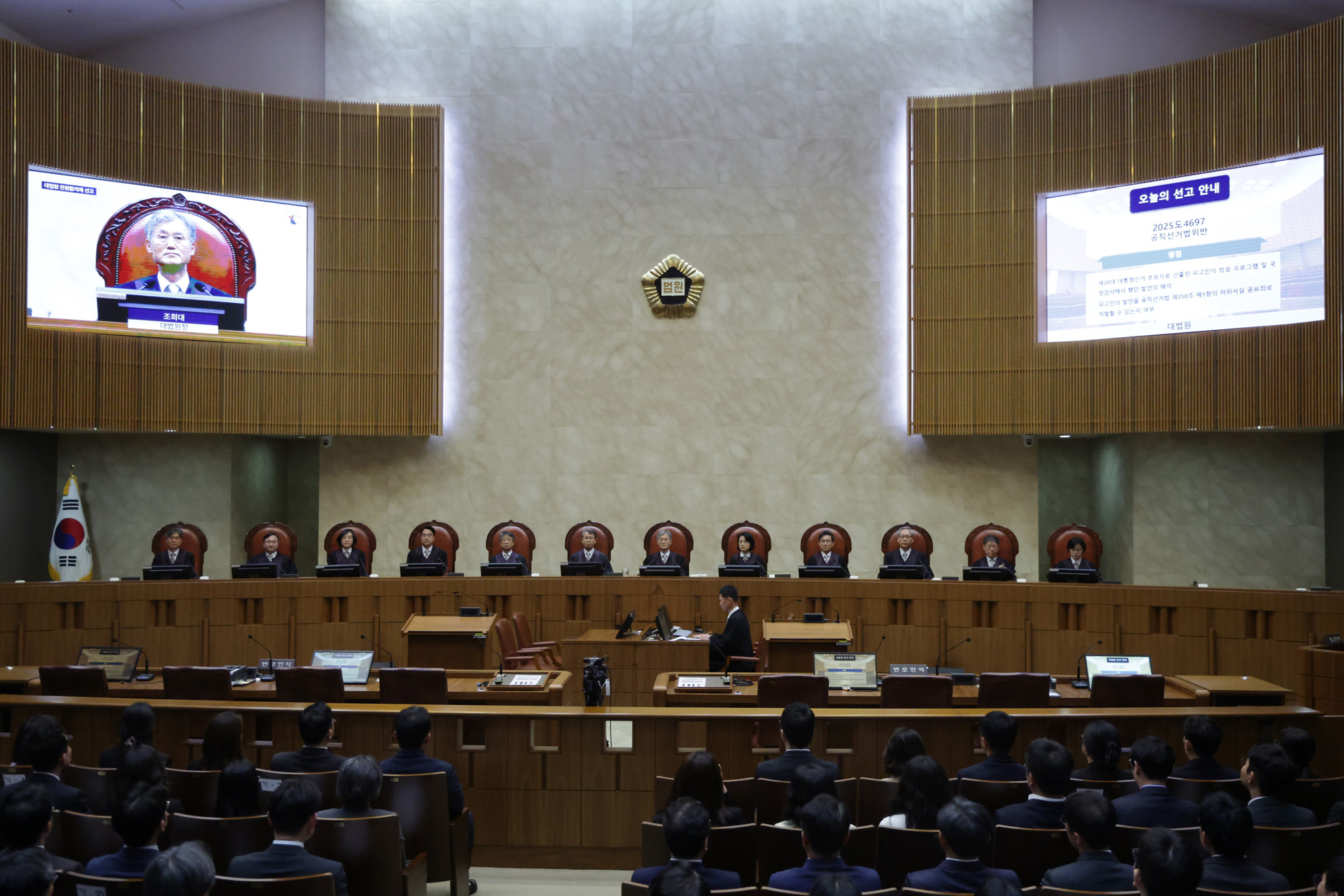 조희대 대법원장을 비롯한 대법관들이 1일 오후 더불어민주당 이재명 대선 후보의 공직선거법 사건 전원합의체 선고를 위해 서울 서초구 대법원 대법정에 입장해 자리에 앉아 있다. 2025.05.01 사진공동취재단