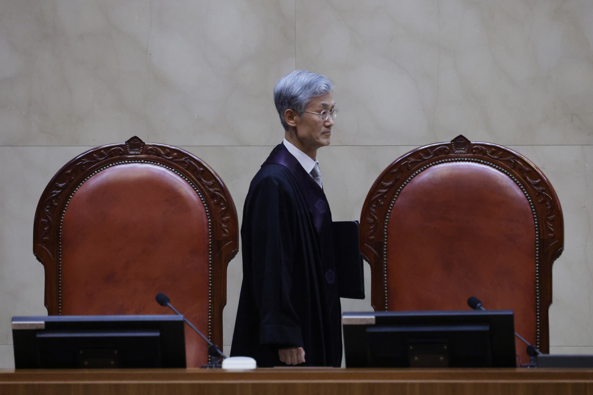 조희대 대법원장이 1일 오후 더불어민주당 이재명 대선 후보의 공직선거법 사건 전원합의체 선고를 위해 서울 서초구 대법원 대법정에 입장해 자리로 향하고 있다. 2025.05.01 사진공동취재단