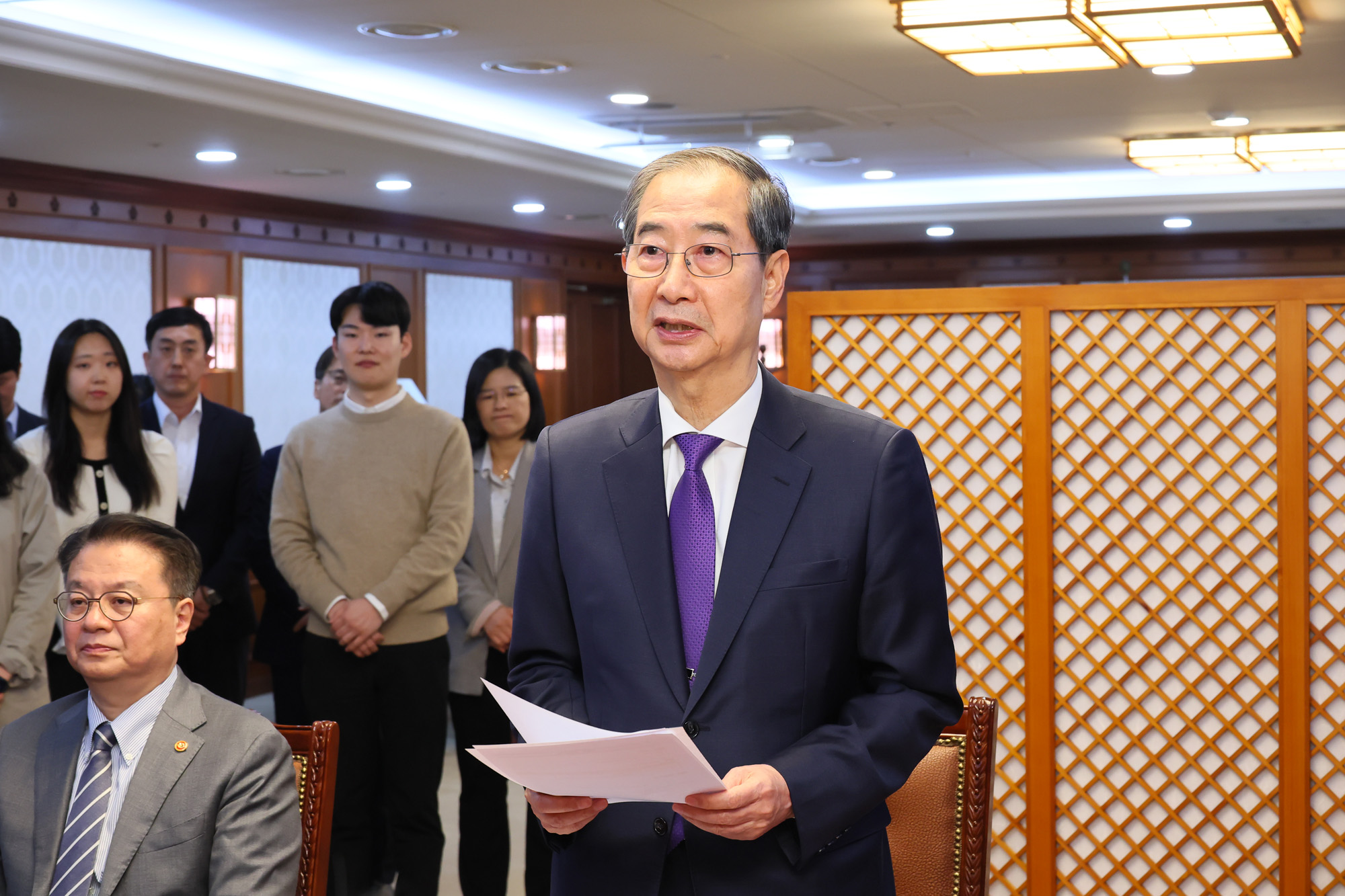 한덕수 대통령 권한대행 국무총리가 1일 오후 서울 종로구 정부서울청사에서 대국민담화를 통해 사퇴를 표명한 뒤 청사 집무실에서 직원들에게 당부의 말을 하고 있다. 2025.05.01. 총리실 제공