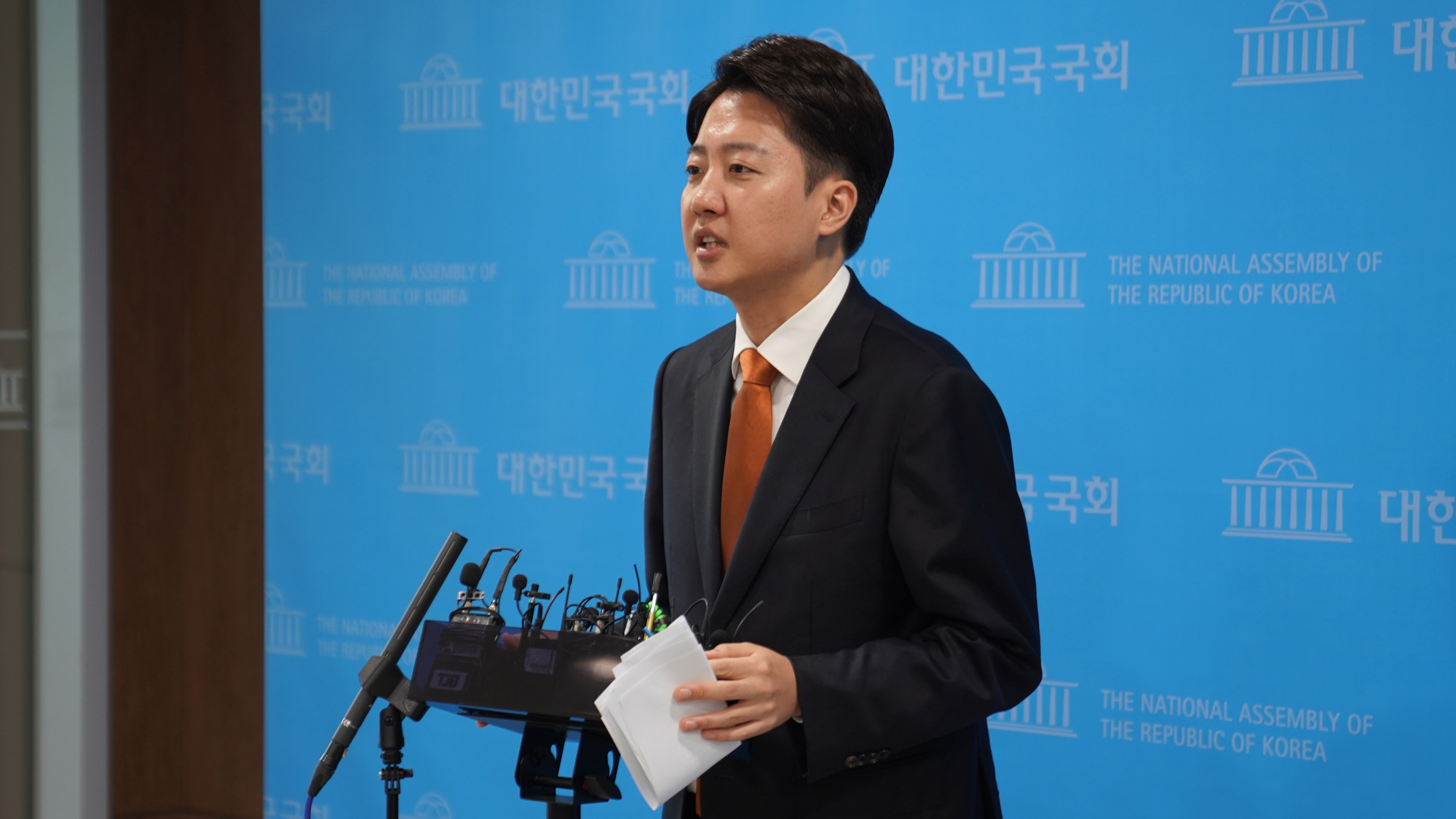 12일 오전 서울 여의도 국회 소통관에서 이준석 개혁신당 대통령선거 후보가 국회에서 기자회견을 한 뒤 백브리핑을 하고 있다.