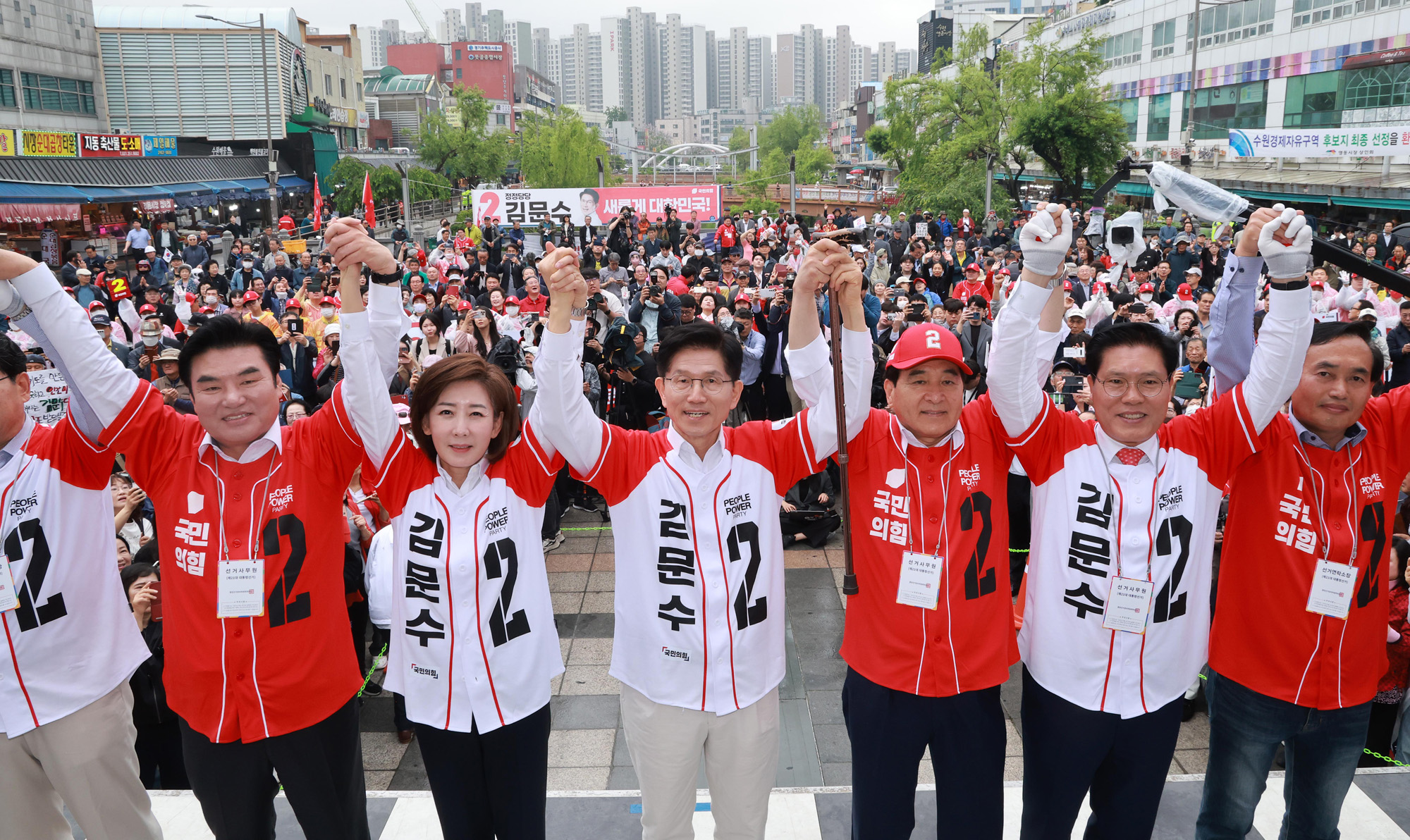 김문수 국민의힘 대선 후보가 16일 경기 수원시 지동시장 앞에서 유권자들을 향해 인사하고 있다. 2025.5.16