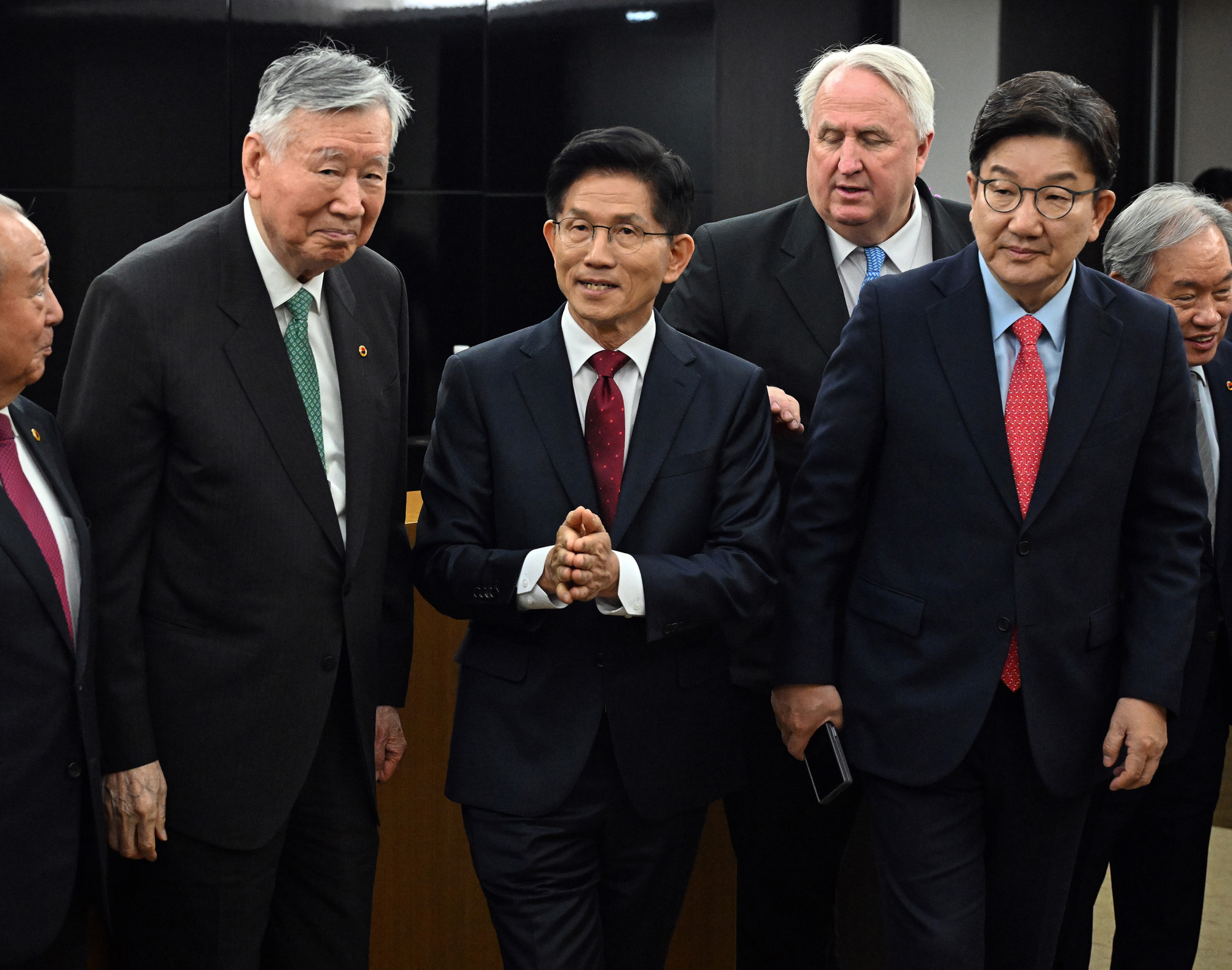 김문수 국민의힘 대선 후보가 19일 서울 중구 부영 태평빌딩에서 열린 대한노인회 간담회를 마친 뒤 나서고 있다. 왼쪽은 이중근 대한노인회장.