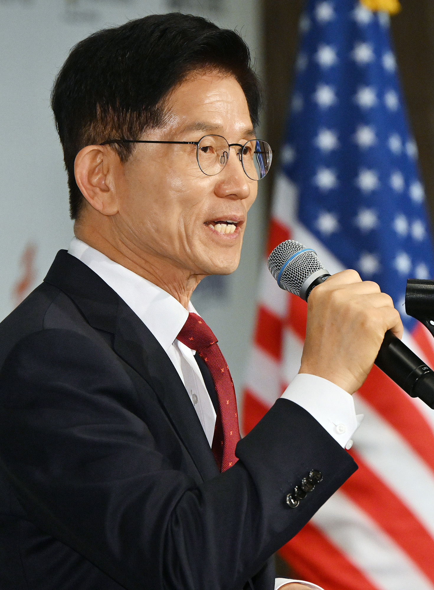 김문수 국민의힘 대선 후보가 19일 서울 종로구 포시즌스호텔에서 열린 주한미국상공회의소(AMCHAM·암참) 초청 특별 오찬 간담회에 참석해 모두발언을 하고 있다.