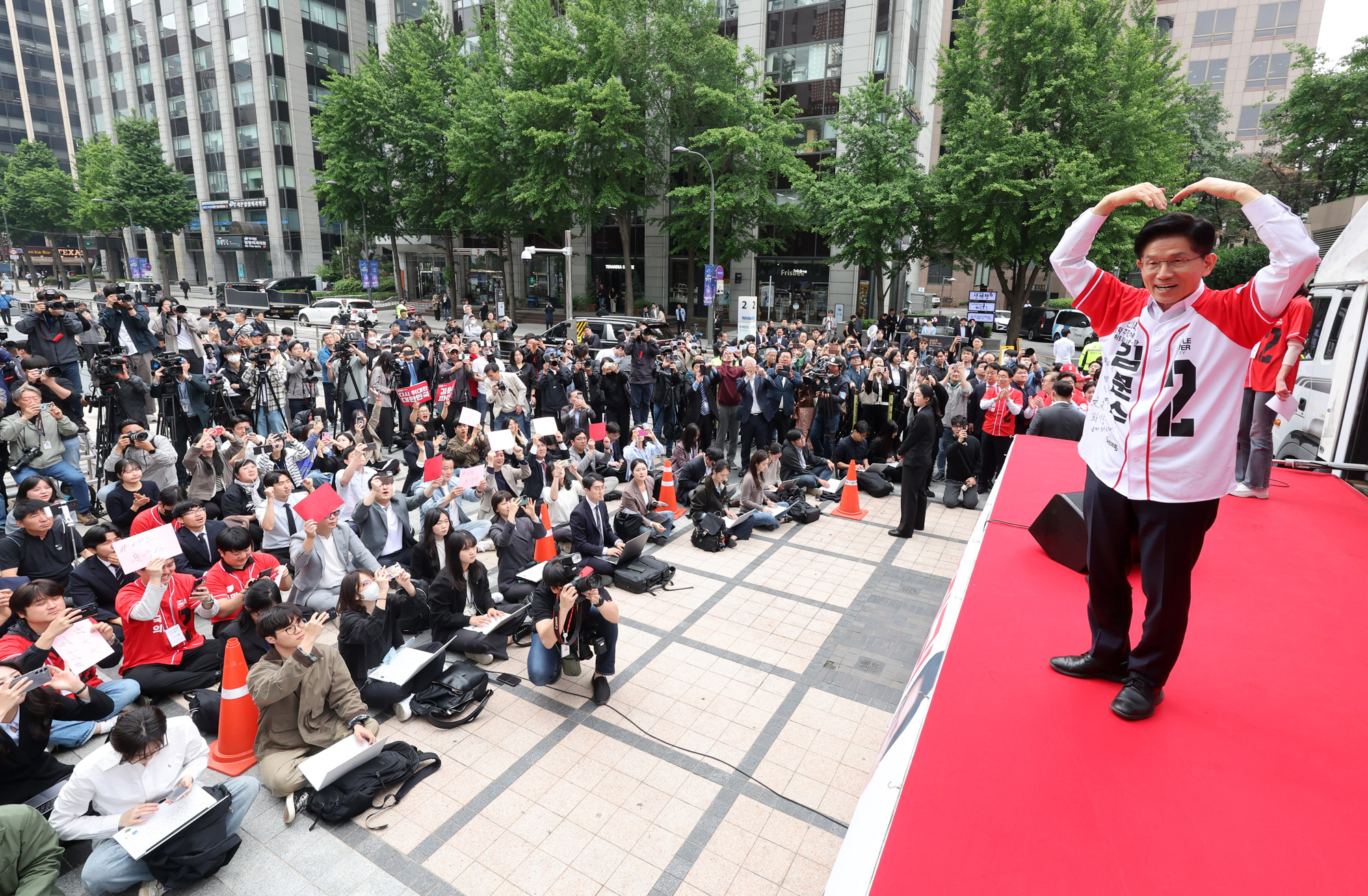 김문수 국민의힘 대선 후보가 19일 서울 청계광장 소라탑 앞에서 “청년이 바라는 대한민국” 정책공약 발표하기 위해 무대에 올라와 인사하고 있다.