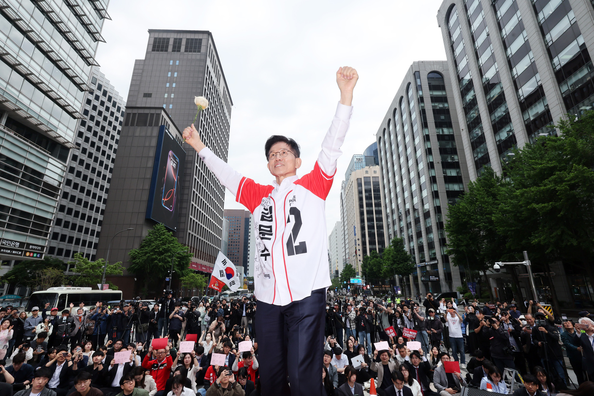 김문수 국민의힘 대선 후보가 19일 서울 청계광장 소라탑 앞에서 “청년이 바라는 대한민국” 정책공약 발표하고 있다.