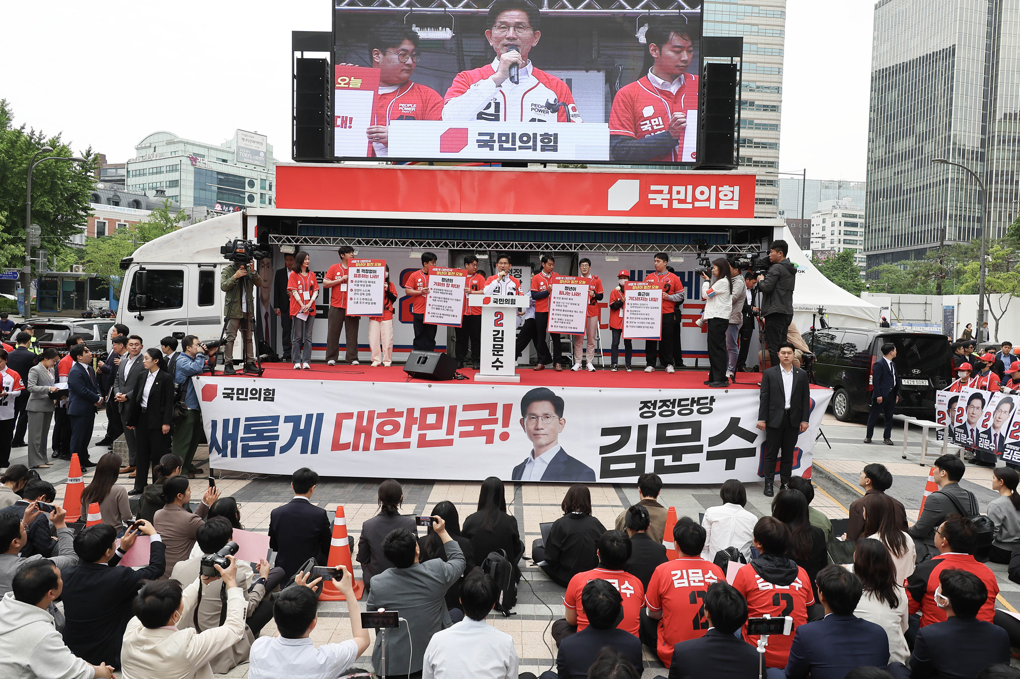 김문수 국민의힘 대선 후보가 19일 오전 서울 중구 청계광장에서 열린 “청년이 바라는 대한민국“ 행사에서 정책을 위한 공약을 발표하고 있다.