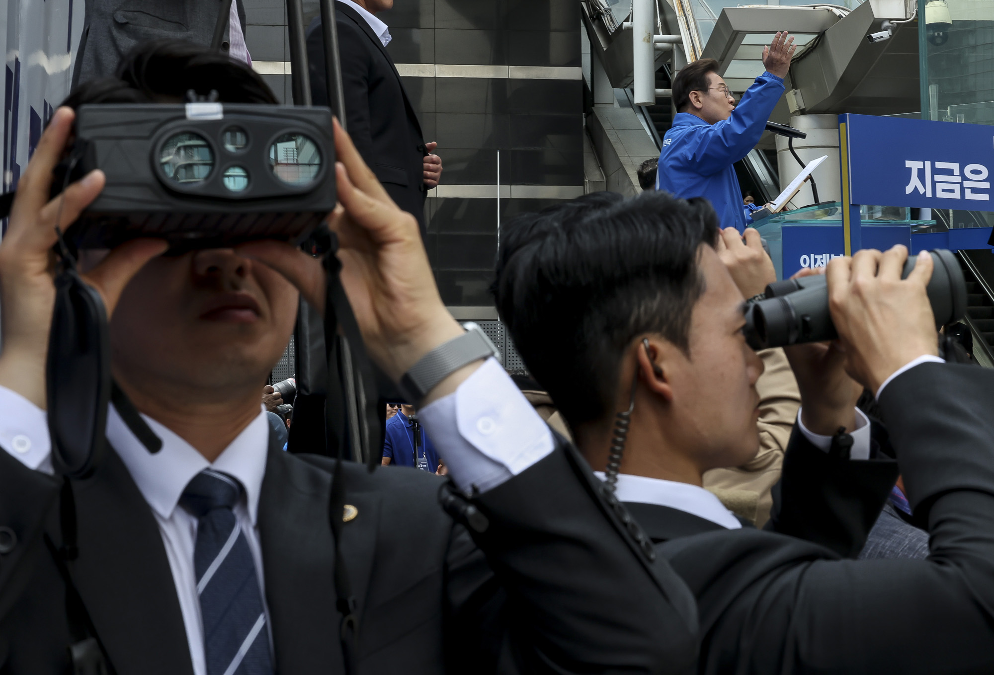 더불어민주당 이재명 대선 후보가 19일 서울 용산역 광장에서 열린 용산구 집중유세에서 유권자들을 향해 지지를 호소하고 있다. 이 후보 아래 무대 인근에서 경호원들이 망원경으로 주변을 감시하고 있다. 2025.05.19