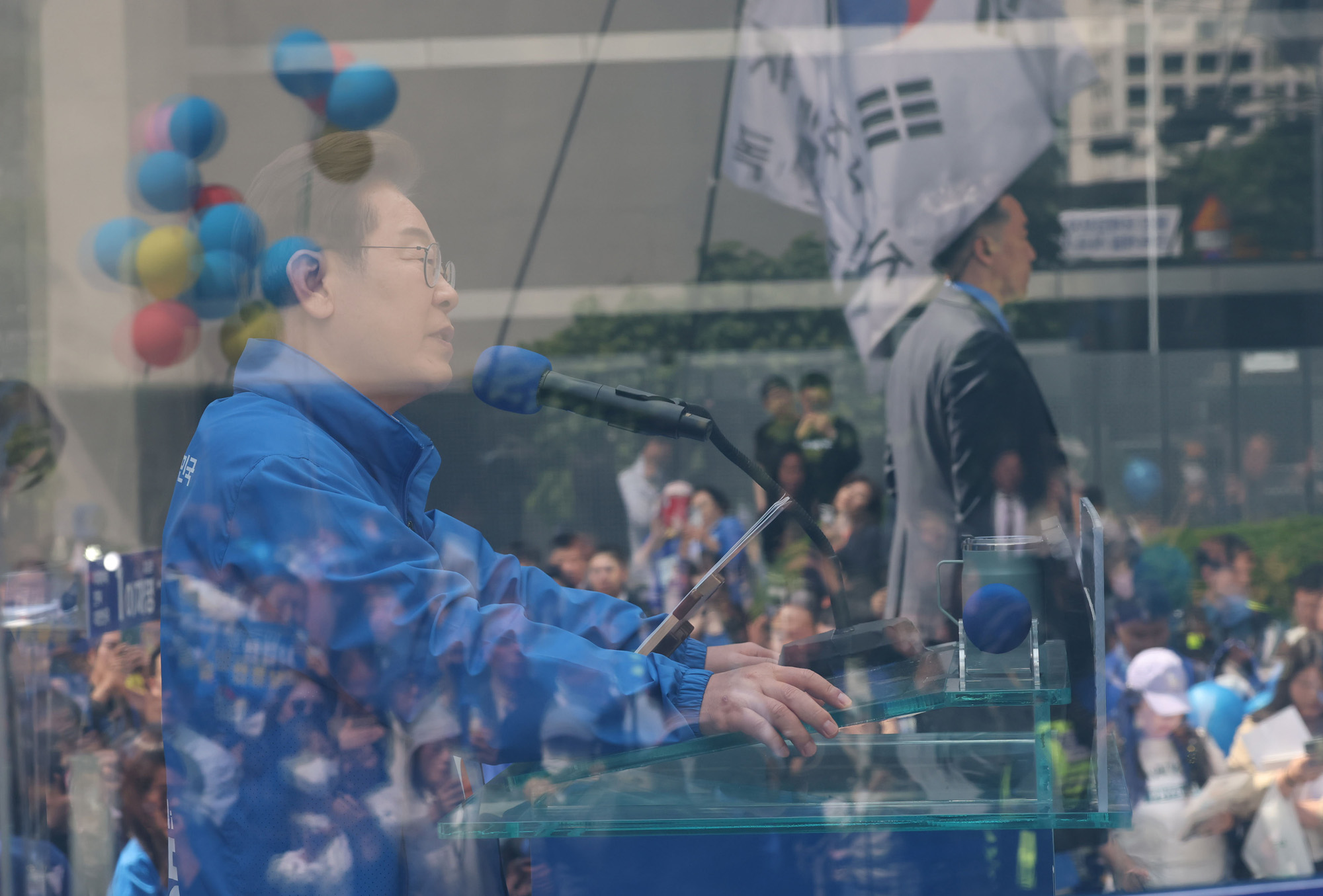이재명 더불어민주당 대선 후보가 19일 서울 용산역광장에서 유세를 하는 동안 연설대 앞에 방탄 유리가 설치돼 있다. 2025.5.19.