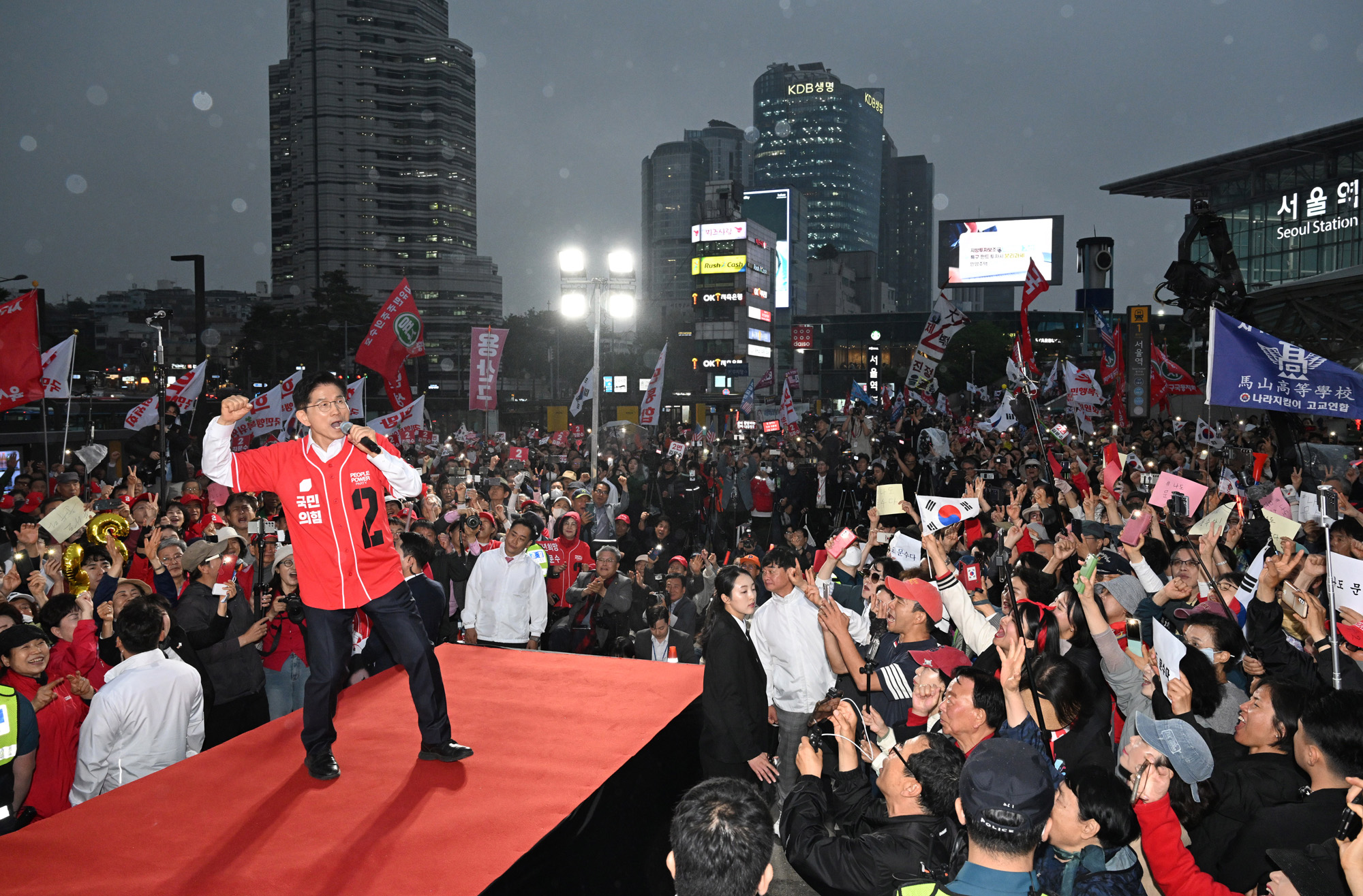 김문수 국민의힘 대선후보가 19일 서울역 광장 유세에서 연설을 하고 있다.