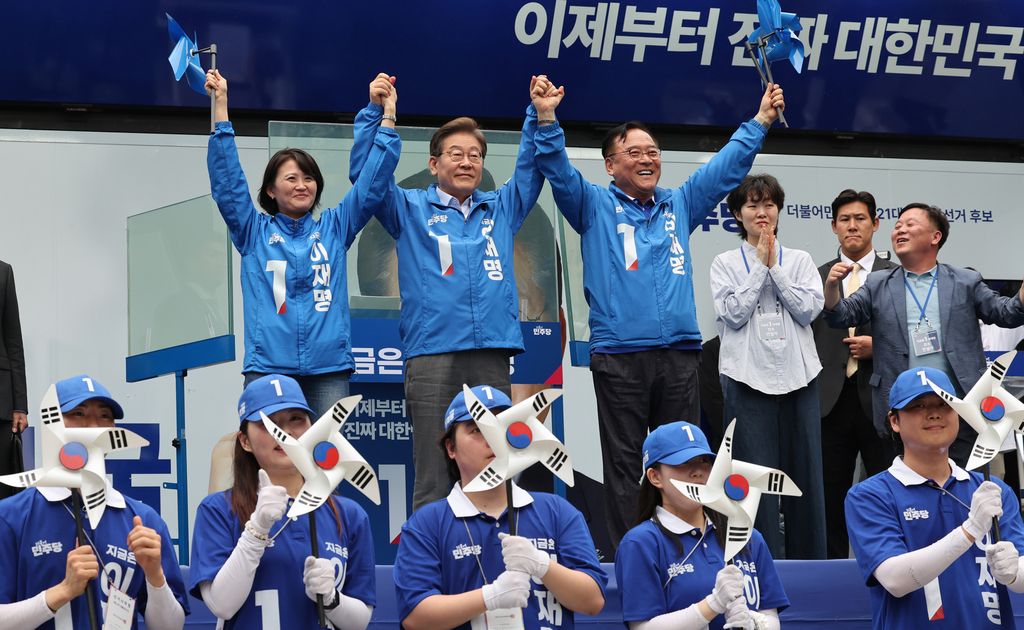 더불어민주당 이재명 대선후보가 20일 경기 의정부시 행복로 태조 이성계상 앞에서 열린 유세에서 박지헤, 이재강 의원과 함게 손을 맞잡고 지지자들에게 답하고 있다.