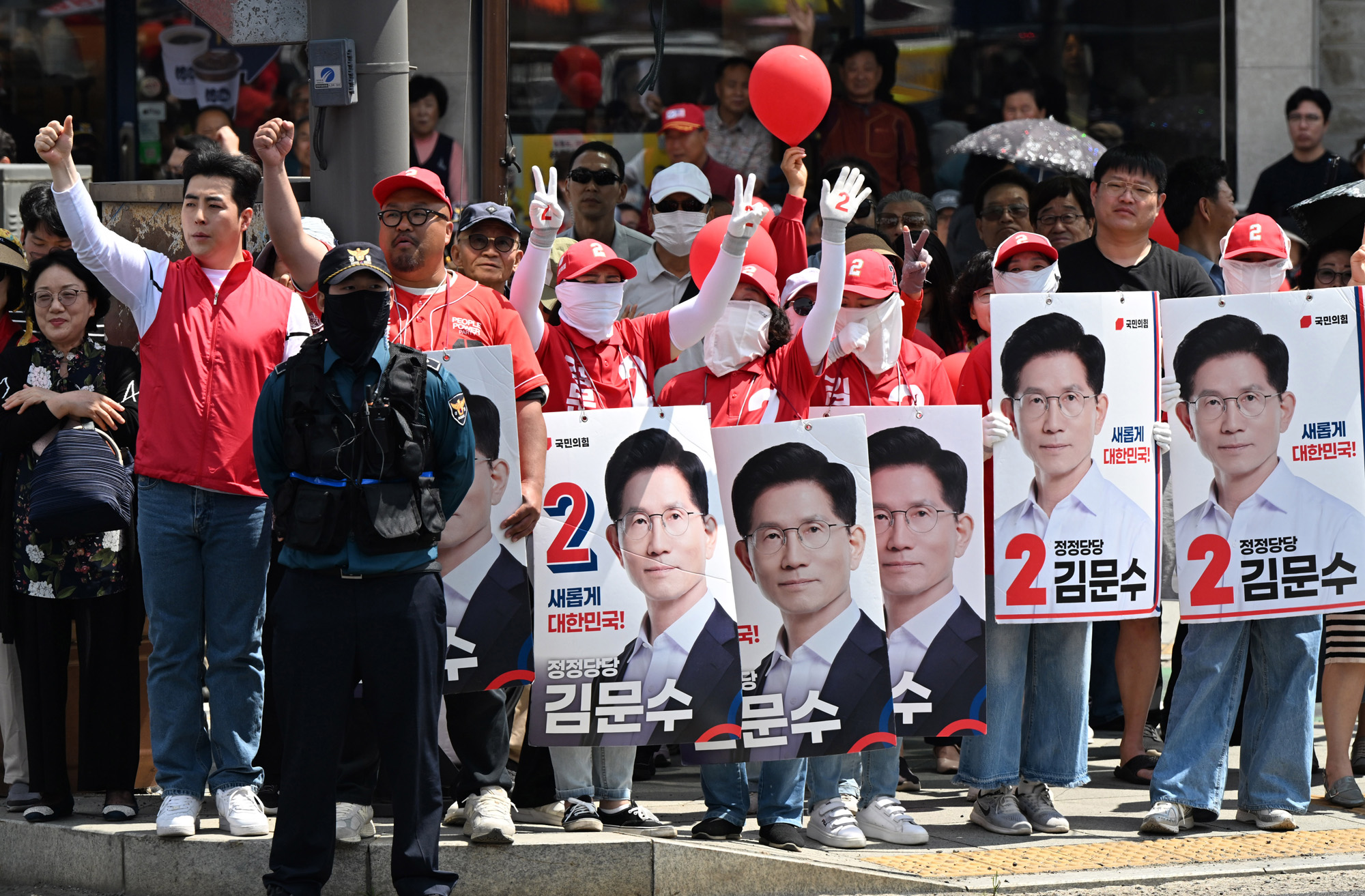 김문수 국민의힘 대선후보 지지자들이 26일 경기 안성중앙시장에서 기호 2번을 외치고 있다.
