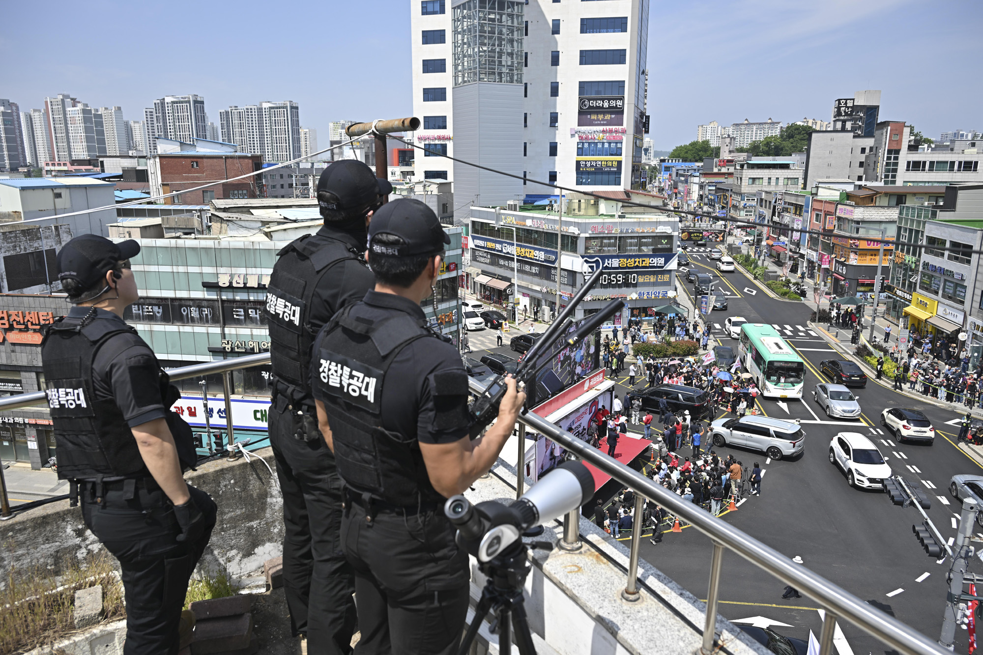 26일 경기 안성시 서인사거리에서 열린 김문수 국민의힘 대선 후보 유세에서 경찰특공대가 경계 근무를 하고 있다. 2025-05-26