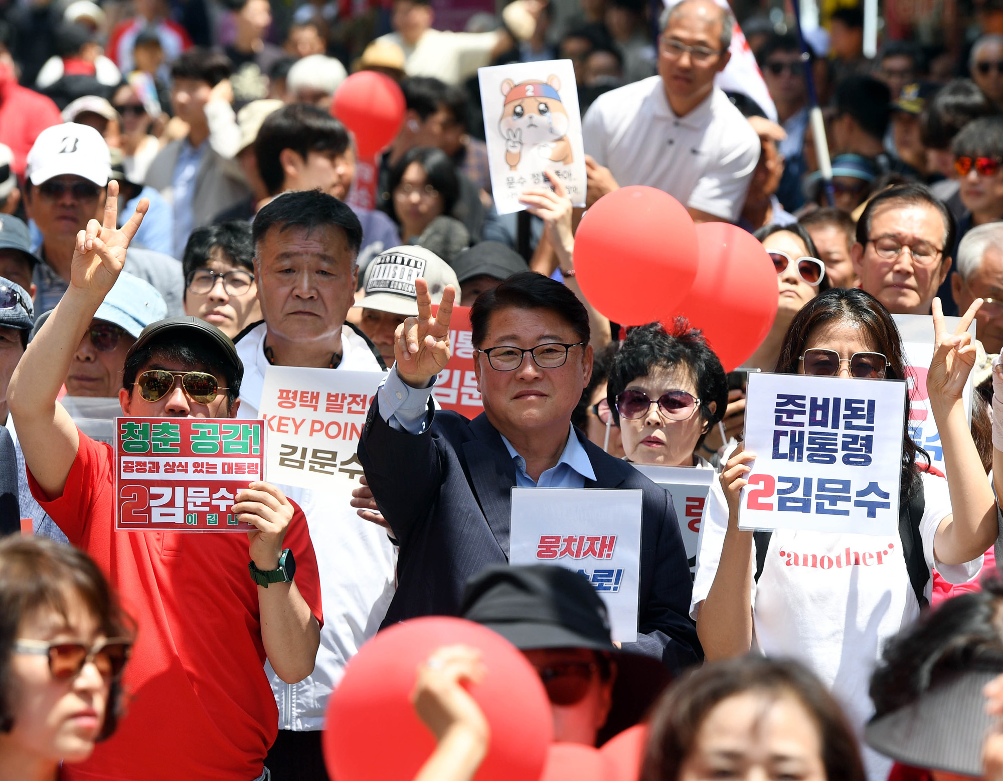 우리공화당 조원진 대표가 26일 오후 경기 평택 미군기지 앞에서 국민의힘 김문수 대선후보 지지 손피켓을 들고 있다.
