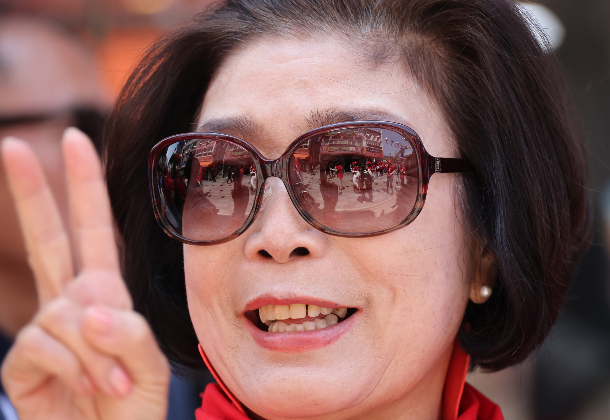 26일 오후 경기 평택 미군기지 앞에서 김문수 국민의힘 대통령 후보 유세가 열려 지지자들이 지켜보고 있다.