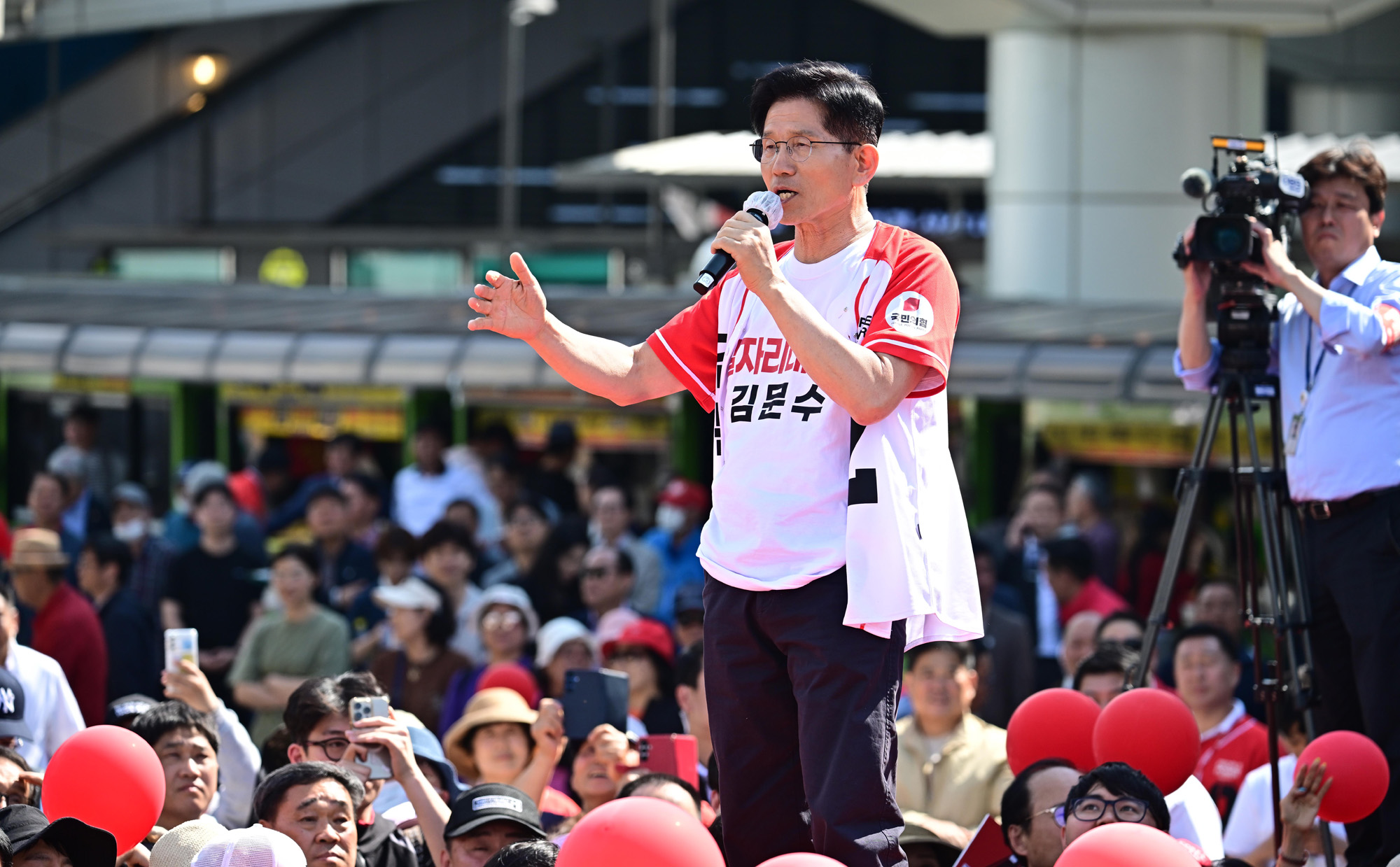 김문수 국민의힘 대통령 후보가 26일 오후 경기도 오산시 오산역광장에서 열린 유세에서 발언하고 있다.