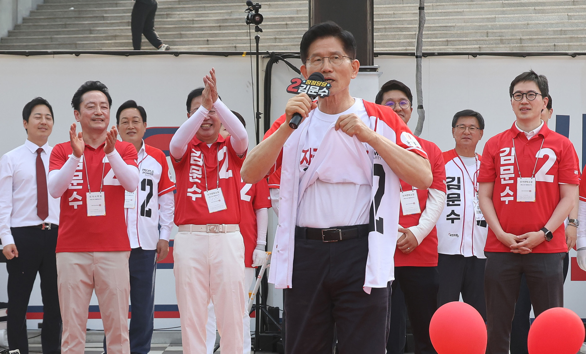 김문수 국민의힘 대선 후보가 26일 오후 경기 용인 포은아트갤러리 광장에서 열린 “내일의 기적을 만들” 집중유세에서 유권자들에게 "자신은 방탄조끼를 안 입었다”라며 겉옷을 열어젖히고 있다.