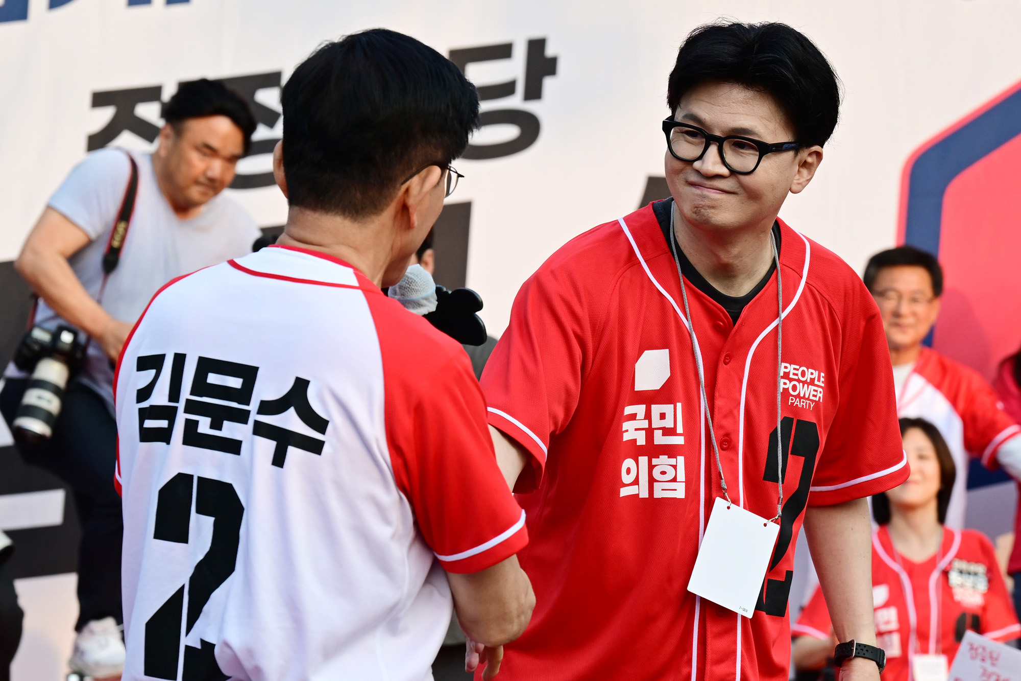 한동훈 전 국민의힘 대표가 26일 오후 서울 도봉구 방학사거리에서 열린 김문수 국민의힘 대선 후보의 노원·도봉·강북 집중유세 현장을 찾아 김 후보와 악수하고 있다.