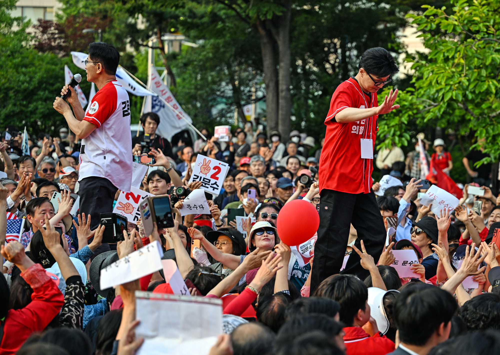 한동훈 전 국민의힘 대표가 26일 서울 도봉구 방학사거리에서 열린 김문수 대선 후보의 '노원·도봉·강북 집중유세'에서 지지 연설을 마친 뒤 떠나고 있다.