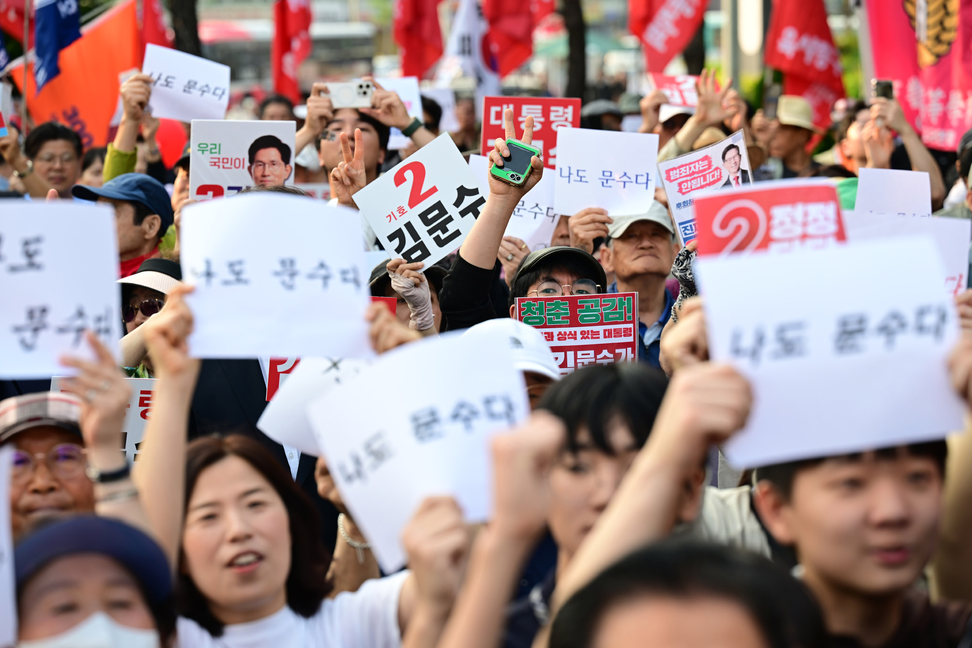 26일 오후 서울 도봉구 방학사거리에서 김문수 국민의힘 대선 후보의 노원·도봉·강북 집중유세를 앞두고 지지자들이 김 후보를 연호하고 있다.