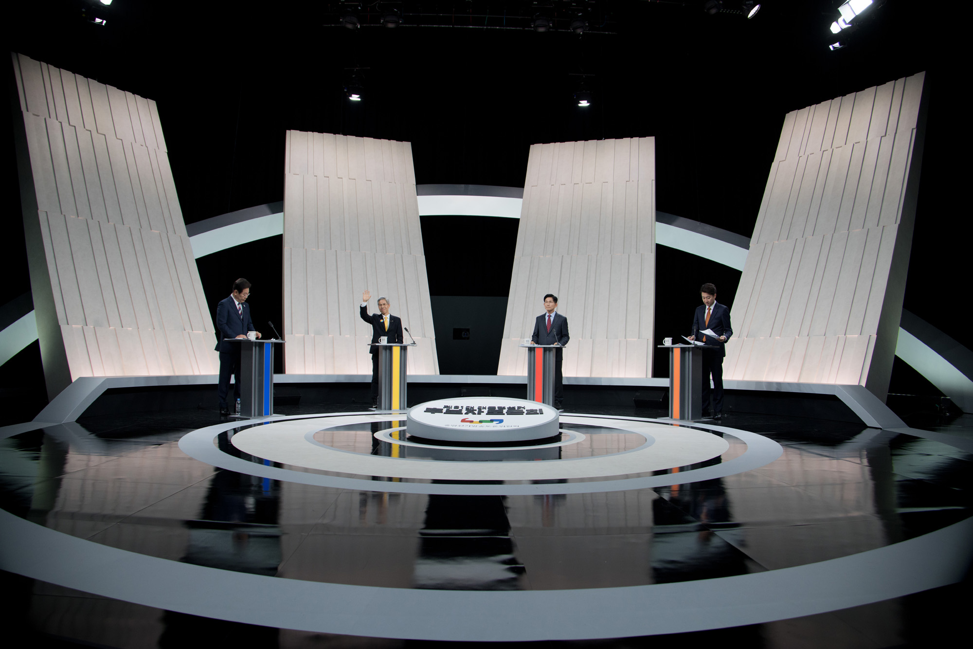 27일 서울 상암 MBC스튜디오에서 열린 21대 대선후보 3차 토론회에 더불어민주당 이재명 후보, 민주노동당 권영국 후보, 국민의힘 김문수 후보, 개혁신당 이준석 후보(좌측부터) 가 참석하여 기념촬영을 하고 있다.