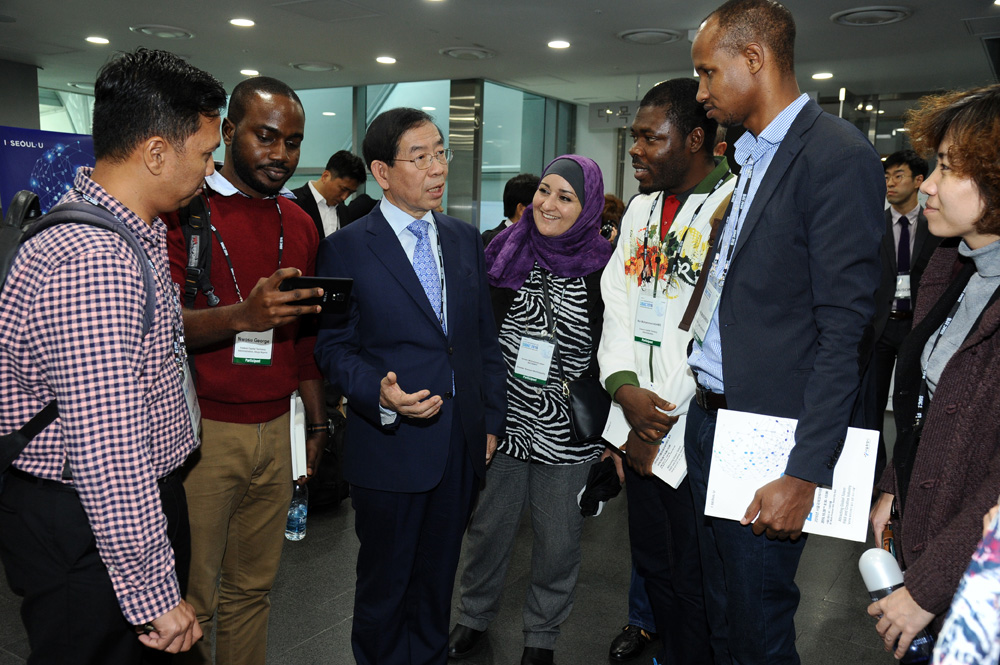 박원순 서울시장이 28일 서울 시청에서 열린 'SIBAC 2016(서울국제경제자문단 총회)'에서 기조연설을 하고 있다. 서울시 제공