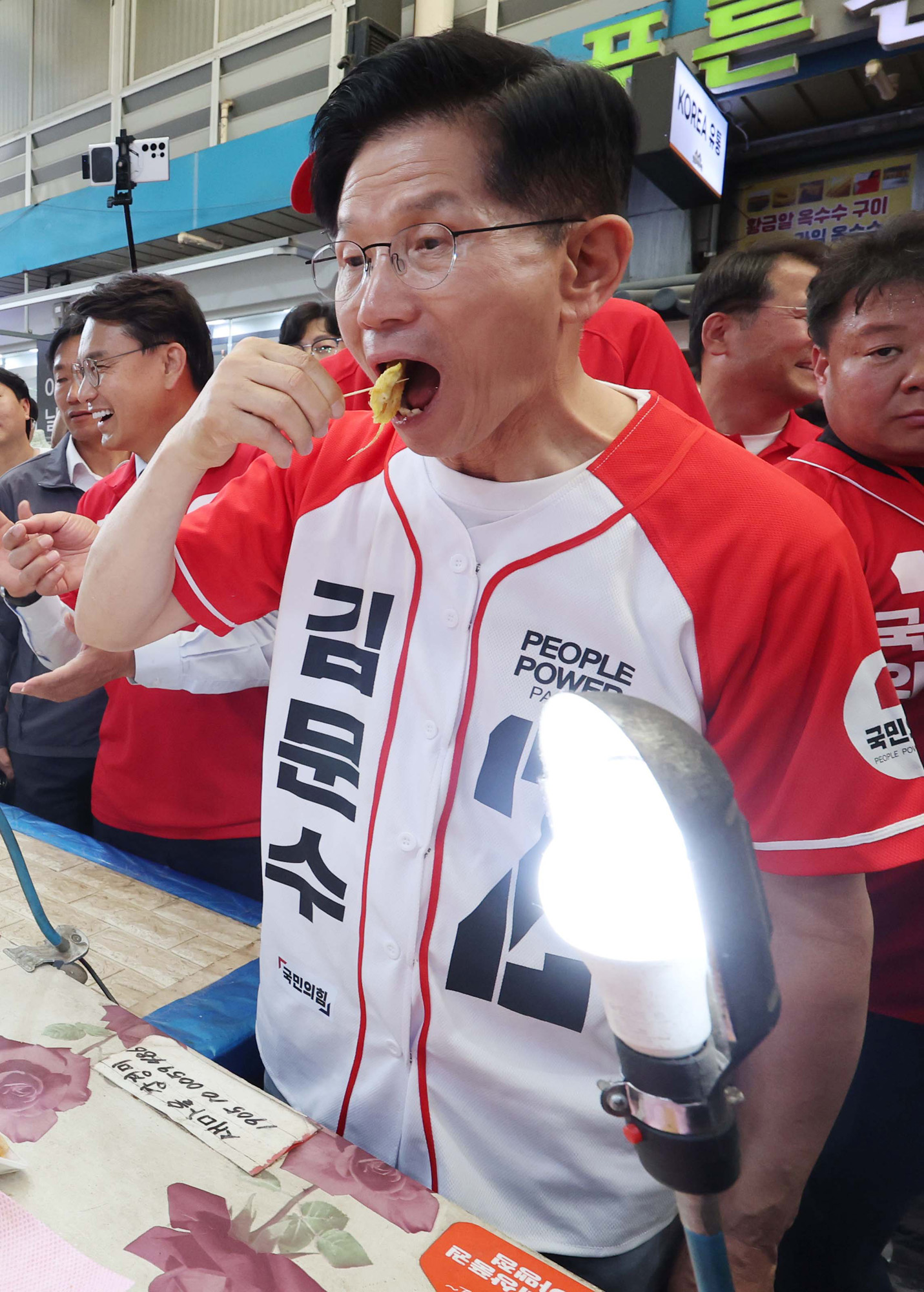 김문수 국민의힘 대선 후보가 29일 인천 남동구 모래내전통시장을 방문해 전을 시식하고 있다. 2025.5.29