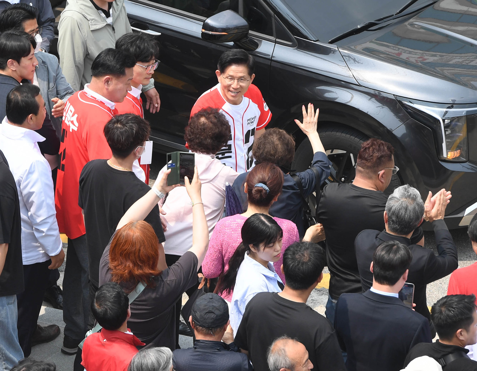 국민의힘 김문수 대선 후보가 29일 오후 경기 시흥 삼미시장 앞에 마련된 유세현장에 도착하고 있다.