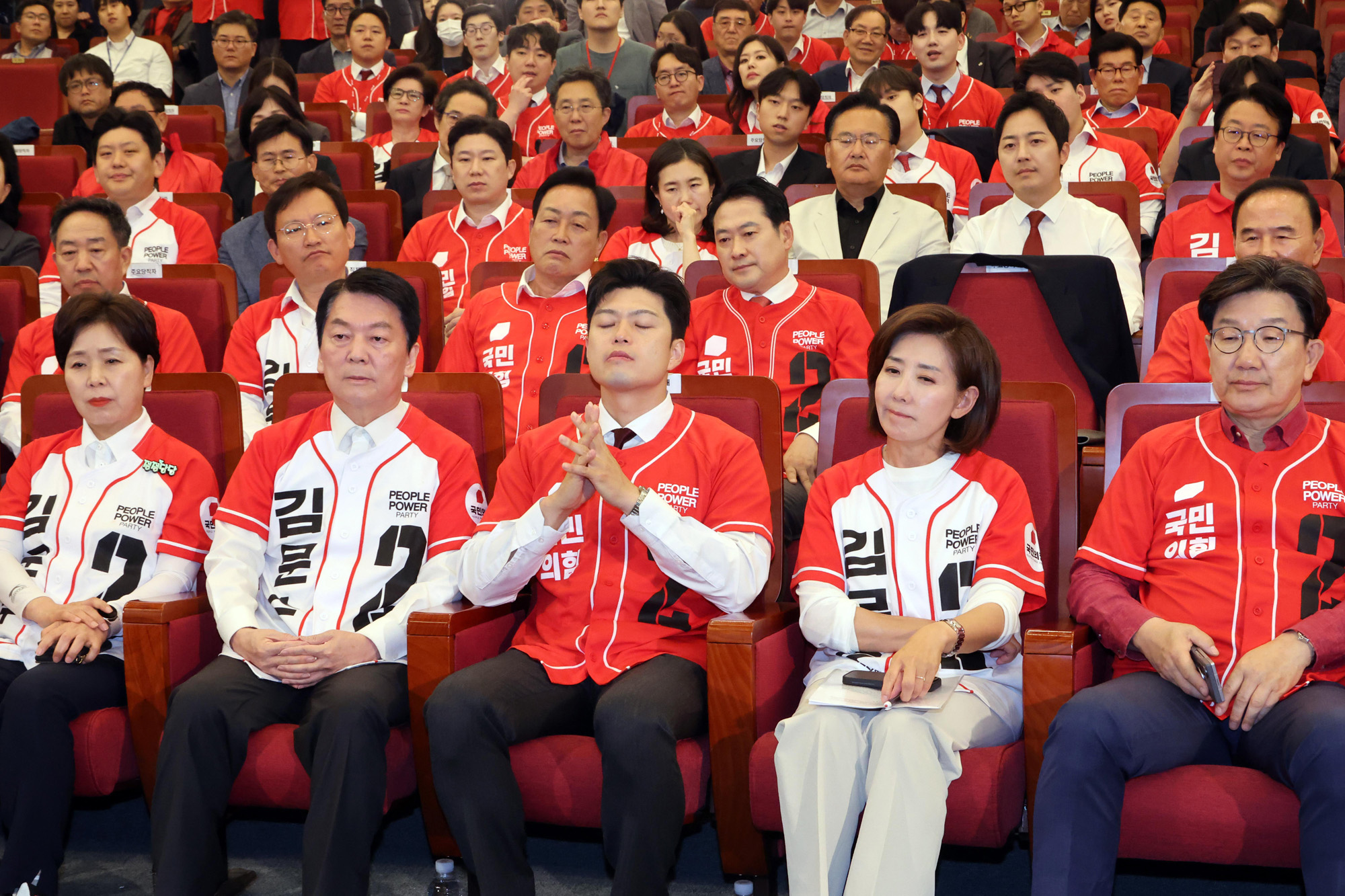 김용태 국민의힘 비상대책위원장과 권성동 원내대표를 비롯한 공동선거대책위원장들이 3일 오후 서울 여의도 국회 도서관에 마련된 제21대 대통령선거개표상황실에서 개표 방송을 시청하고 있다.