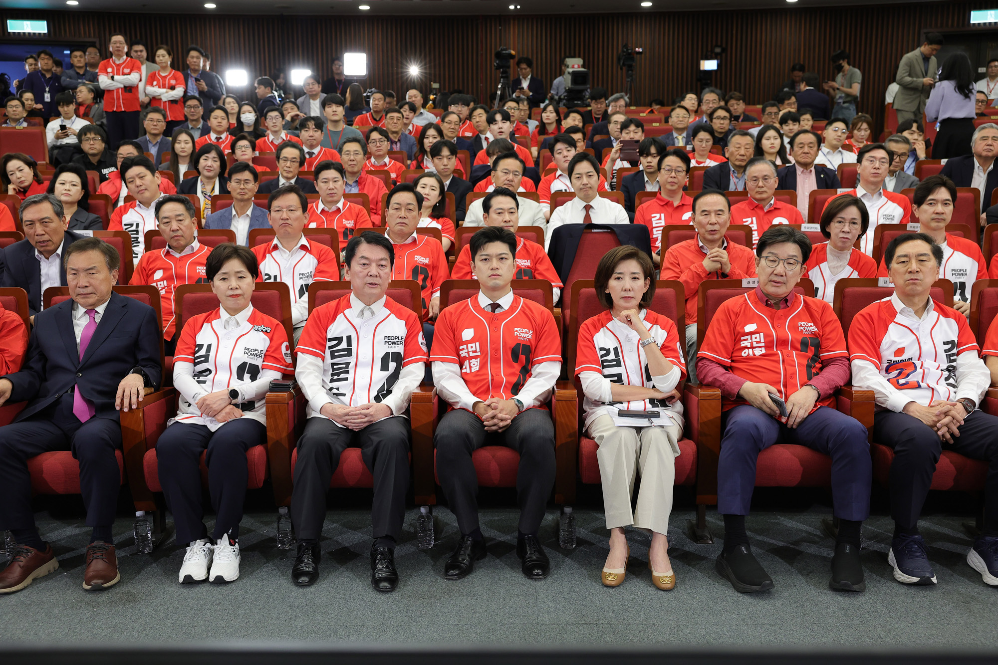 3일 서울 여의도 국회 도서관에 마련된 국민의힘 개표 상황실에서 선대위원장들이 제21대 대통령 선거 방송3사 출구조사 결과를 보고 있다. (왼쪽부터)손학규, 양향자, 안철수, 김용태, 나경원, 권성동, 김기현./2025.06.03./
