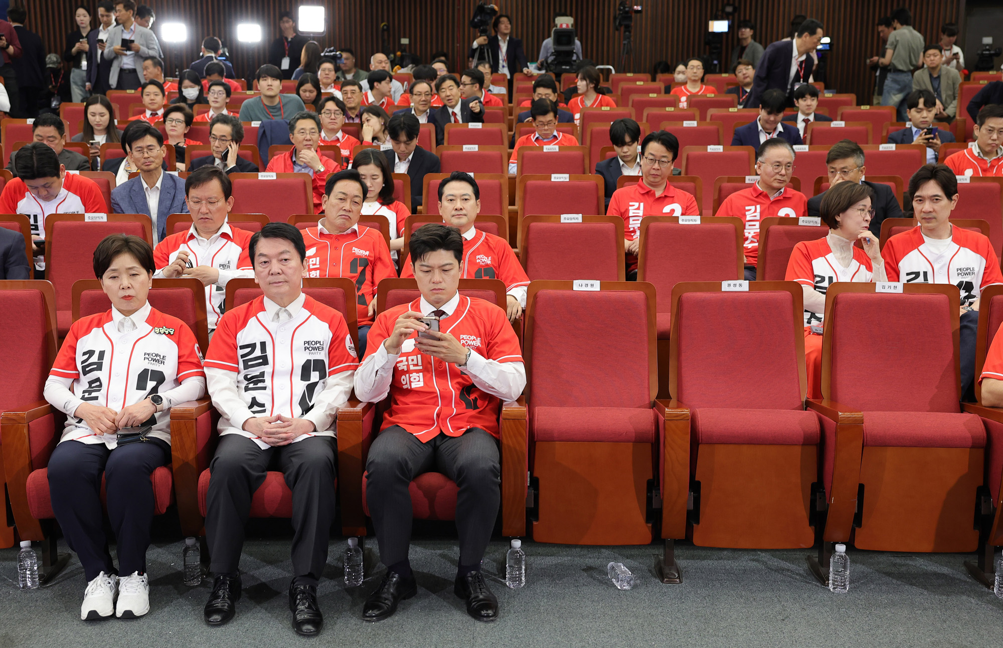 3일 서울 여의도 국회 도서관에 마련된 국민의힘 개표 상황실에서 선대위원장들이 제21대 대통령 선거 방송3사 출구조사 결과과 나오자 자리를 나서고 있다./2025.06.03./