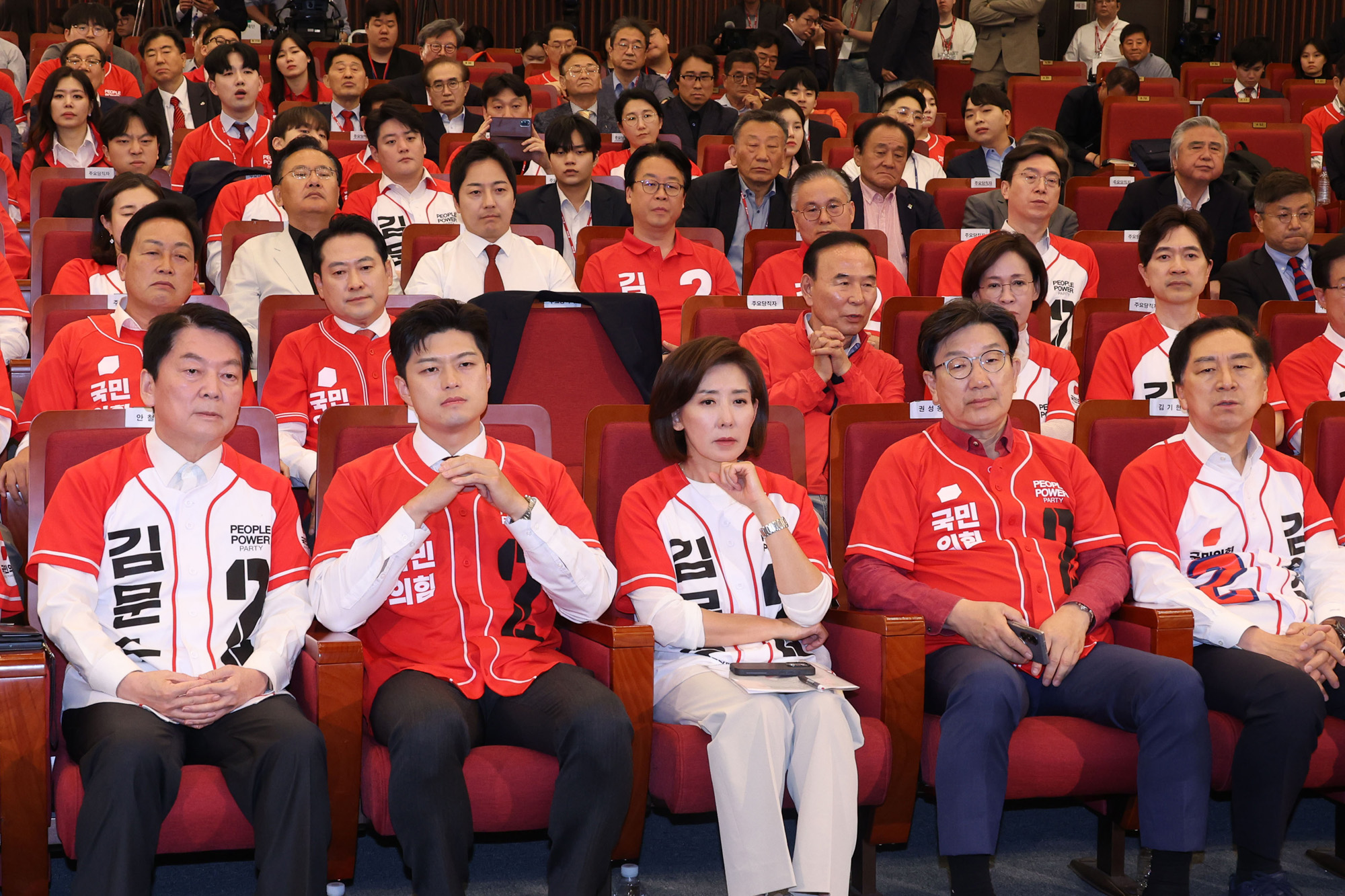 국민의힘 안철수(앞줄 왼쪽부터) 공동선대위원장, 김용태 비상대책위원장, 나경원 공동선대위원장, 권성동 원내대표 겸 공동선대위원장, 김기현 공동선대위원장 등 당 지도부가 3일 서울 여의도 국회 도서관에 마련된 국민의힘 개표 상황실에서 제21대 대통령 선거 방송3사 출구조사 결과를 보며 굳은 표정을 짓고 있다. |