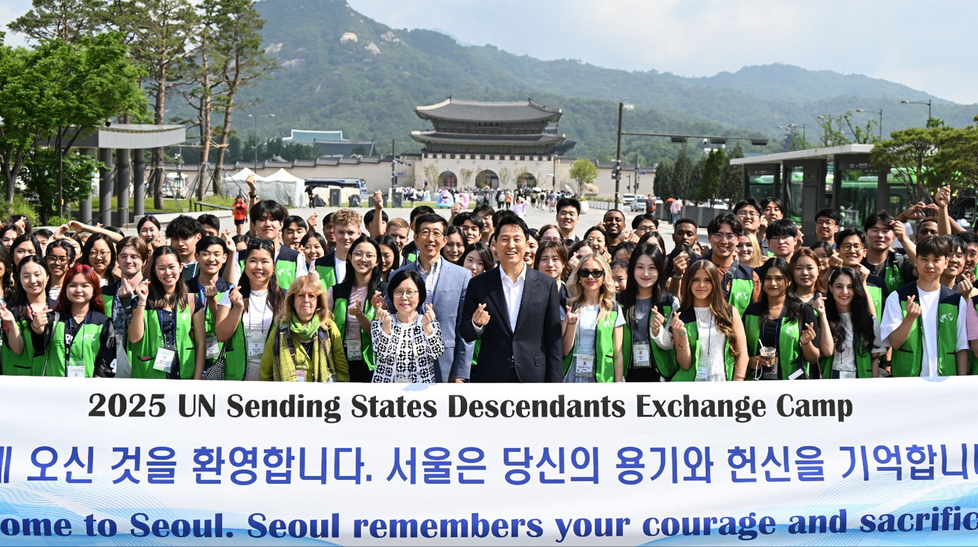오세훈 서울시장이 8일(일) 광화문광장에서 '유엔참전국 후손 교류캠프' 참가자와 기념 촬영하고 있다. 서울시 제공