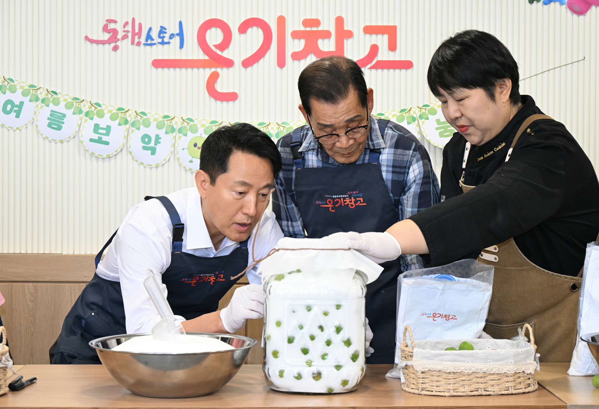 오세훈 서울시장이 23일 오전 10시 30분 영등포 쪽방촌에서 열린 ‘온기창고 3호점(영등포구 경인로 829, 1층)’ 개소식에 참석하고 있다. 서울시 제공