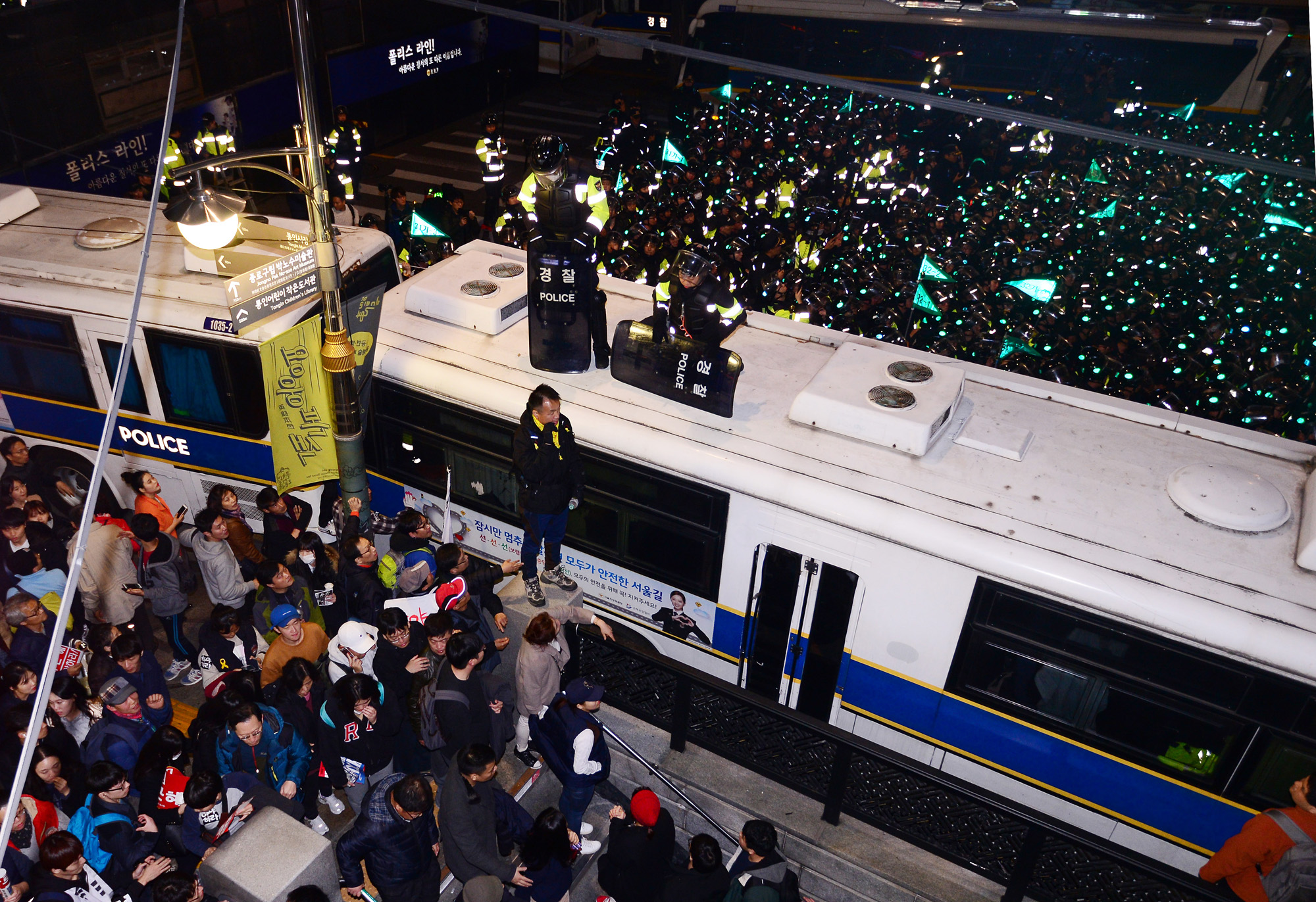 12일 광화문 제3차 촛불집회(민중총궐기) 대회를 마친 시위대가 청와대 쪽으로 진출하다 차벽에 막혀 내자동에서 경찰과 대채하고 있다.