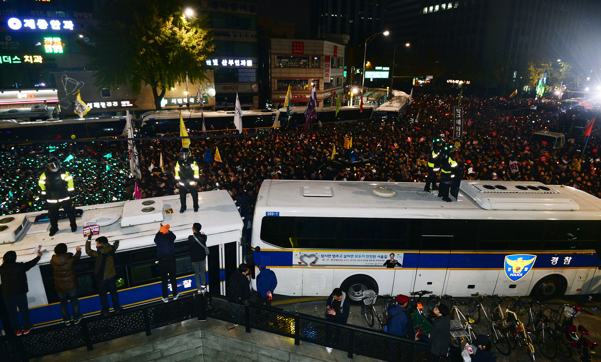 12일 광화문 제3차 촛불집회(민중총궐기) 대회를 마친 시위대가 청와대 쪽으로 진출하다 차벽에 막혀 내자동에서 경찰과 대채하고 있다.