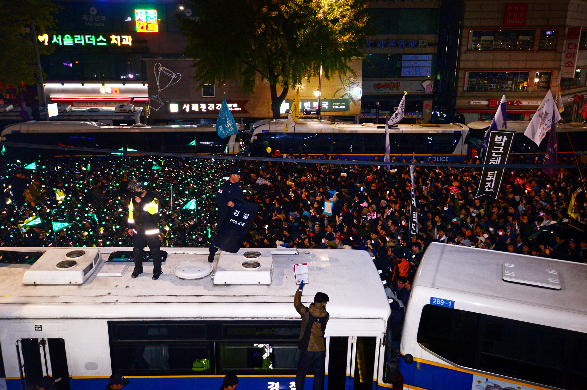 12일 광화문 제3차 촛불집회(민중총궐기) 대회를 마친 시위대가 청와대 쪽으로 진출하다 차벽에 막혀 내자동에서 경찰과 대채하고 있다.