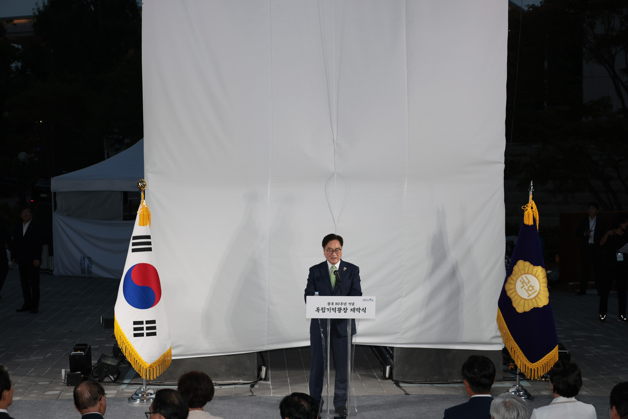 14일 광복80주년 전야제 행사의 일환으로 국회에서 열린 독립기억광장 제막식에 참석한 우원식 국회의장이 기념사를 하고 있다