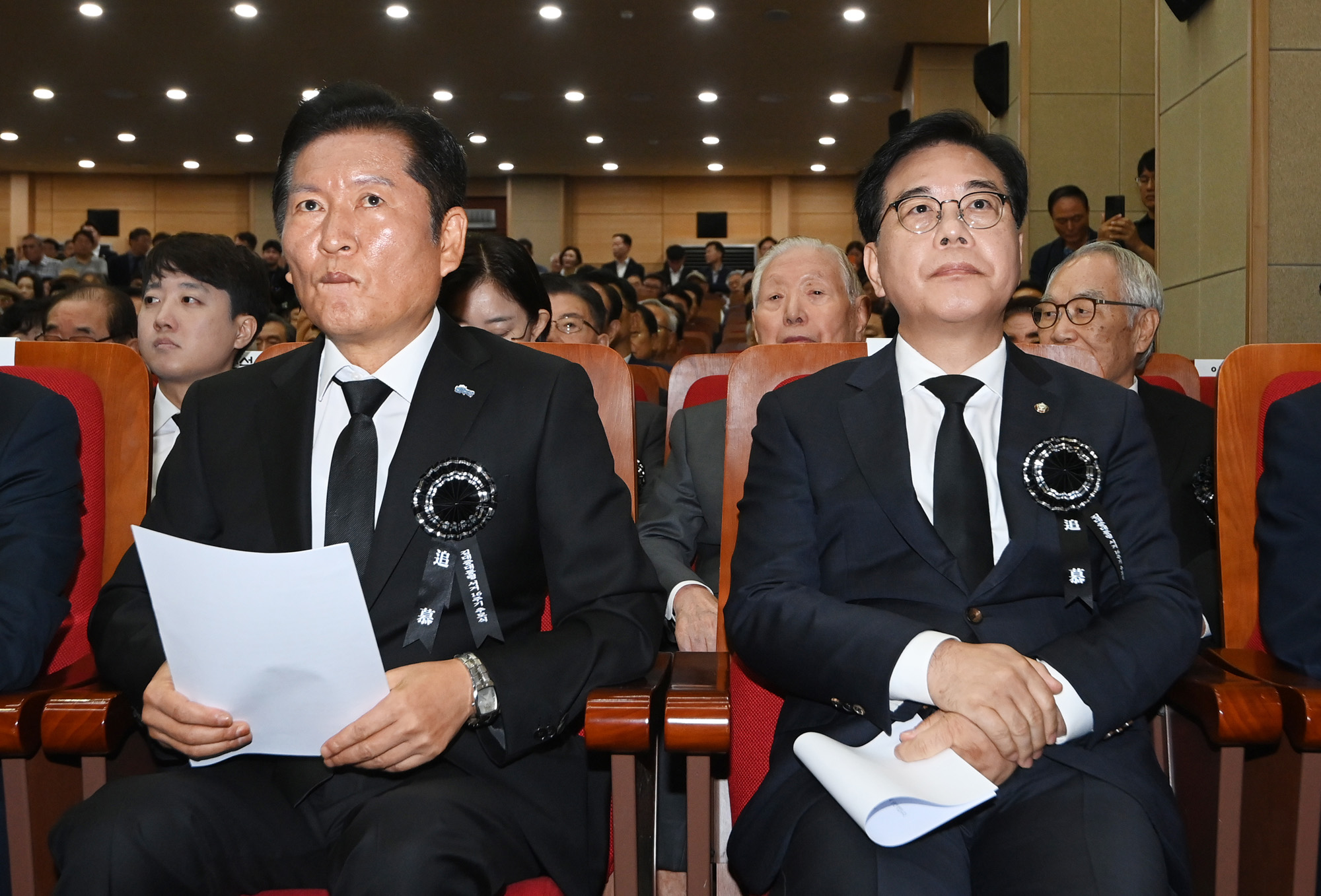 정청래 더불어민주당 대표(왼쪽)와 송언석 국민의힘 비상대책위원장 겸 원내대표가 18일 서울 동작구 국립서울현충원 현충관에서 열린 '김대중 전 대통령 서거 16주기 추도식'에 참석하고 있다.